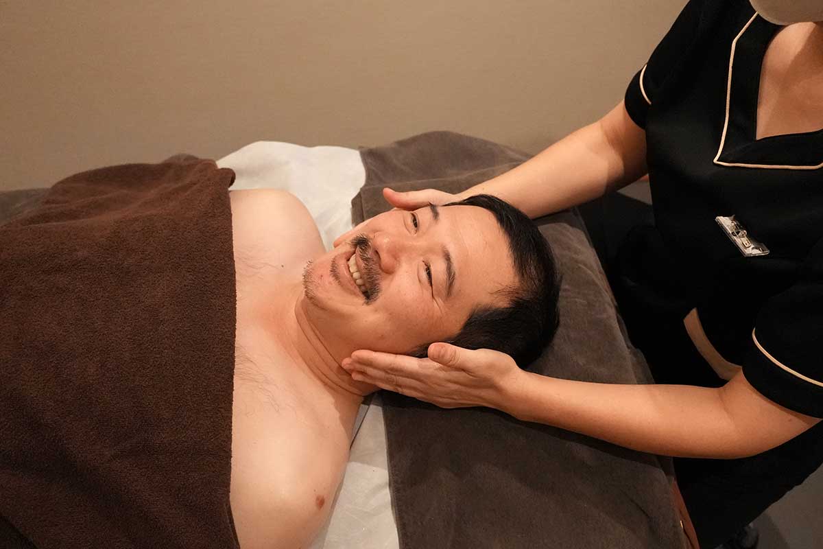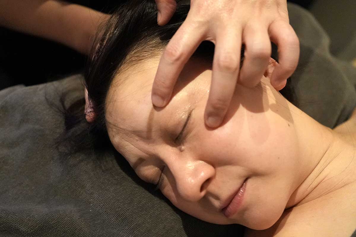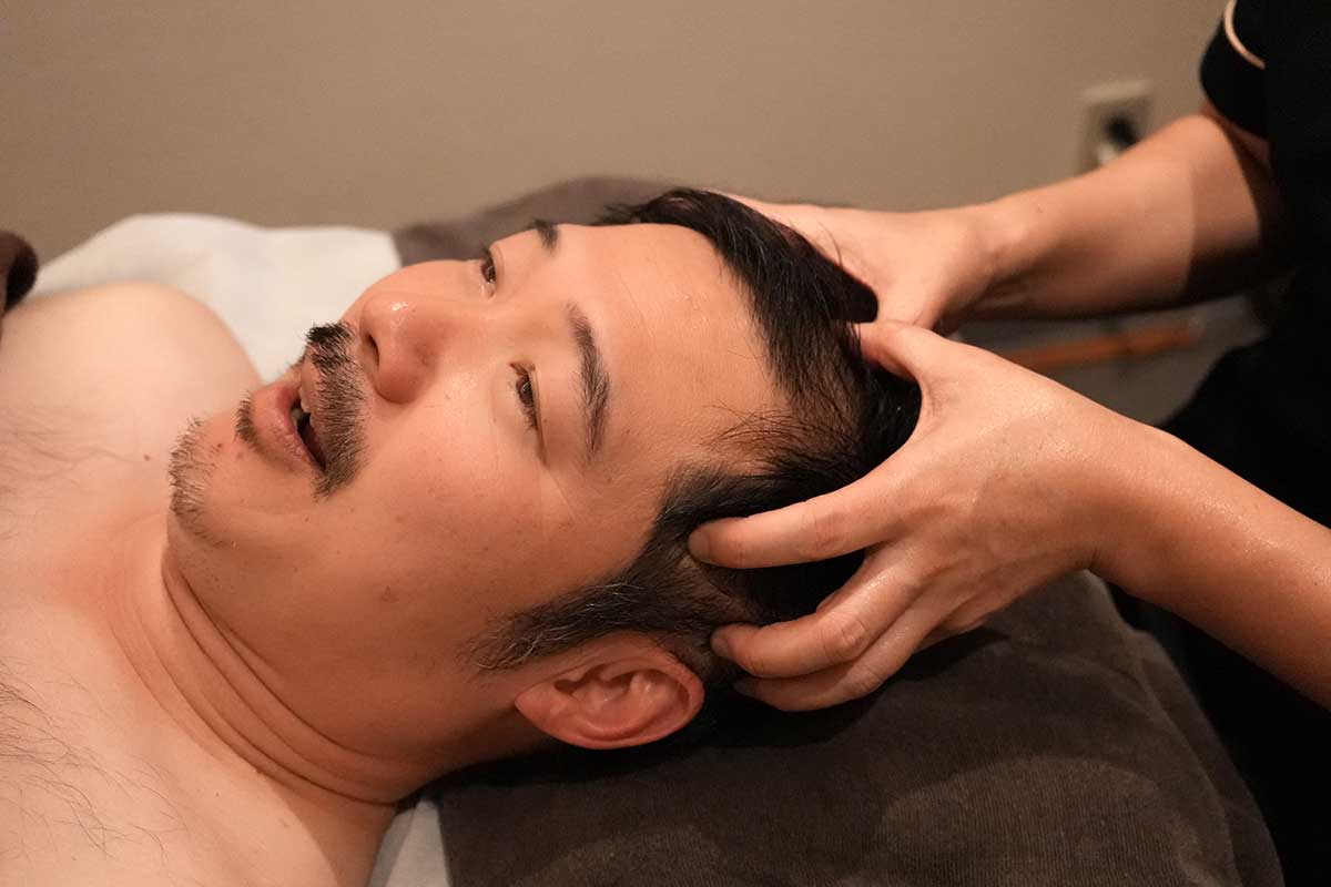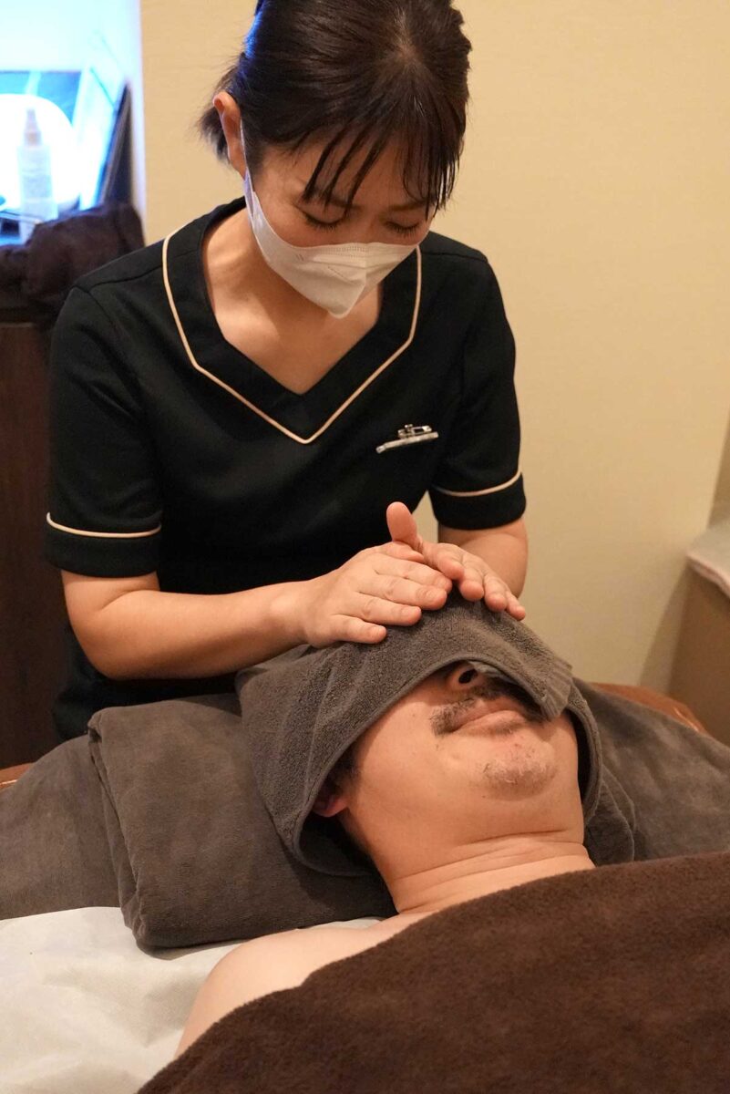 首・肩・眼精疲労に効くという上半身&ヘッドスパを施術してもらいます。