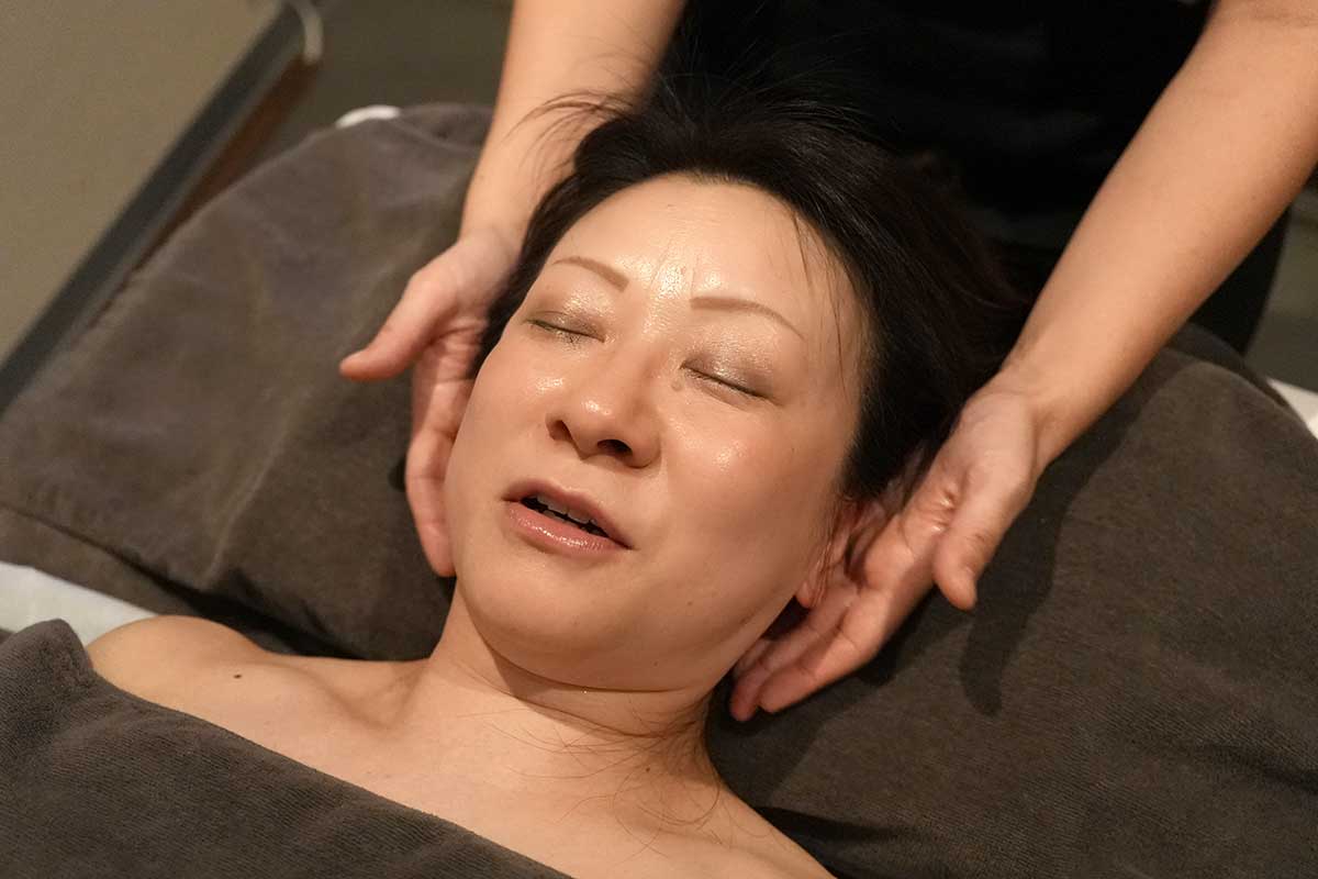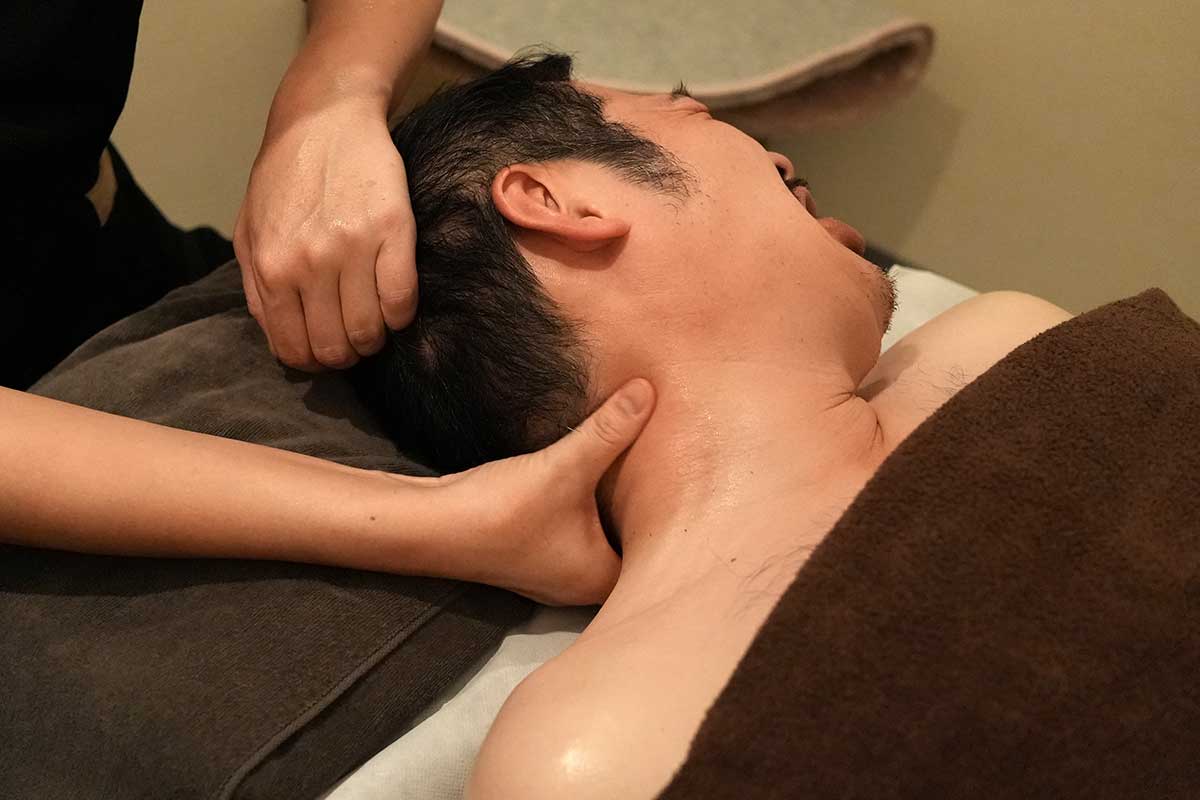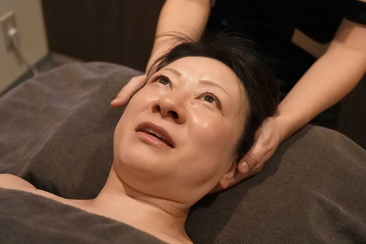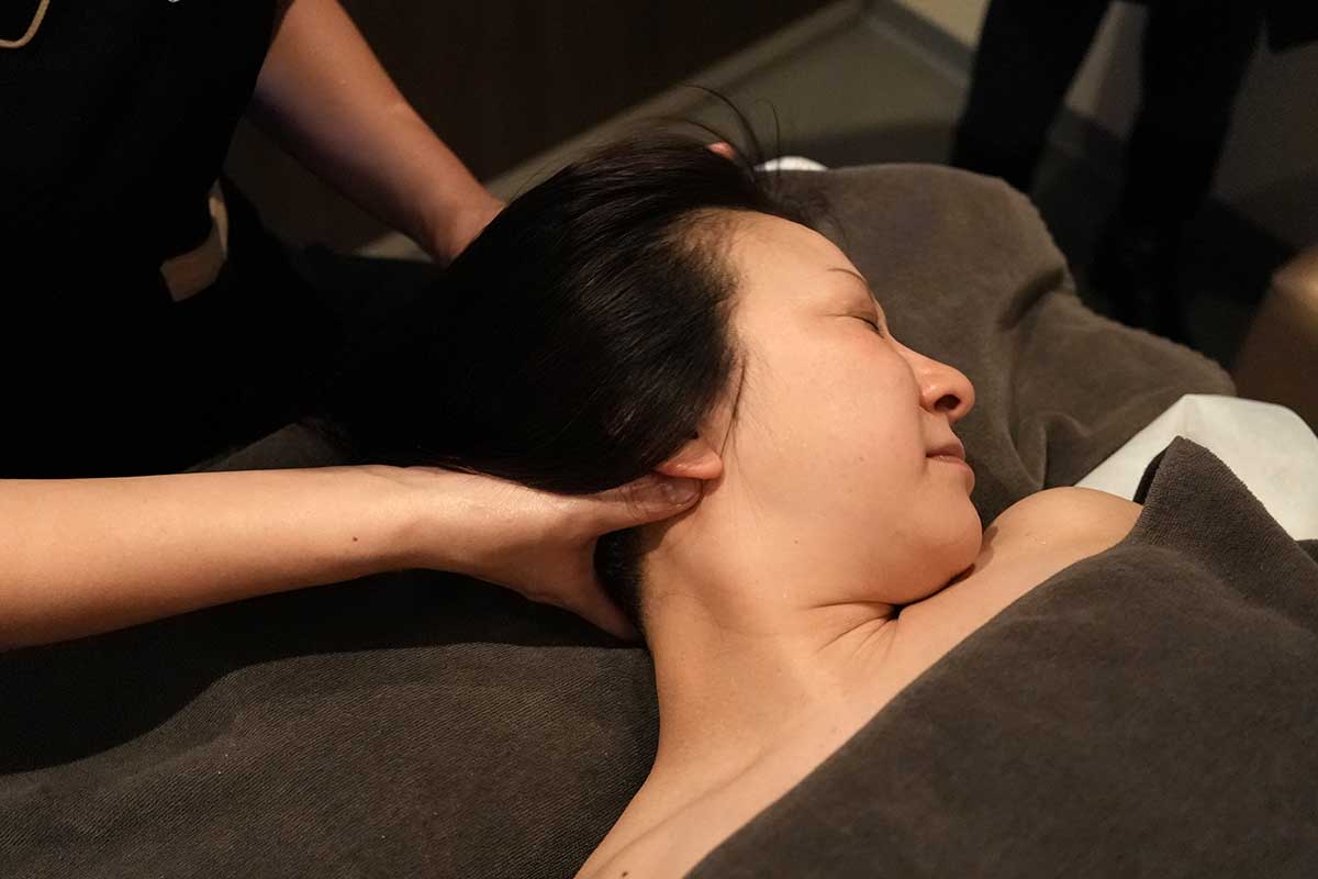 首・肩・眼精疲労に効くという上半身&ヘッドスパを施術してもらいます。