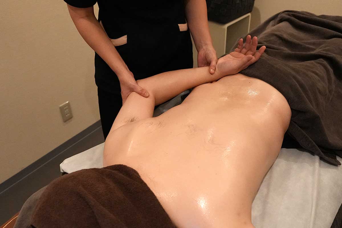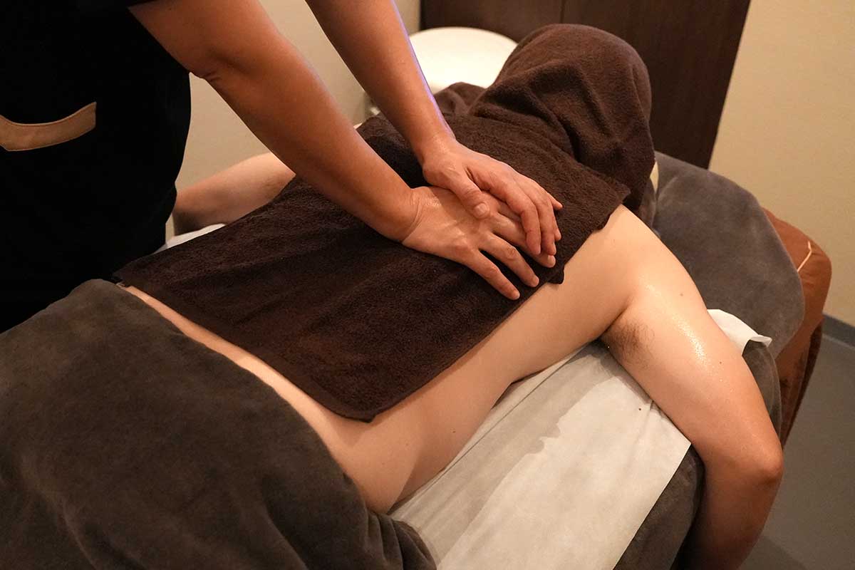 背中全体にオイルを塗って、指圧を加えながらマッサージしていきます。
