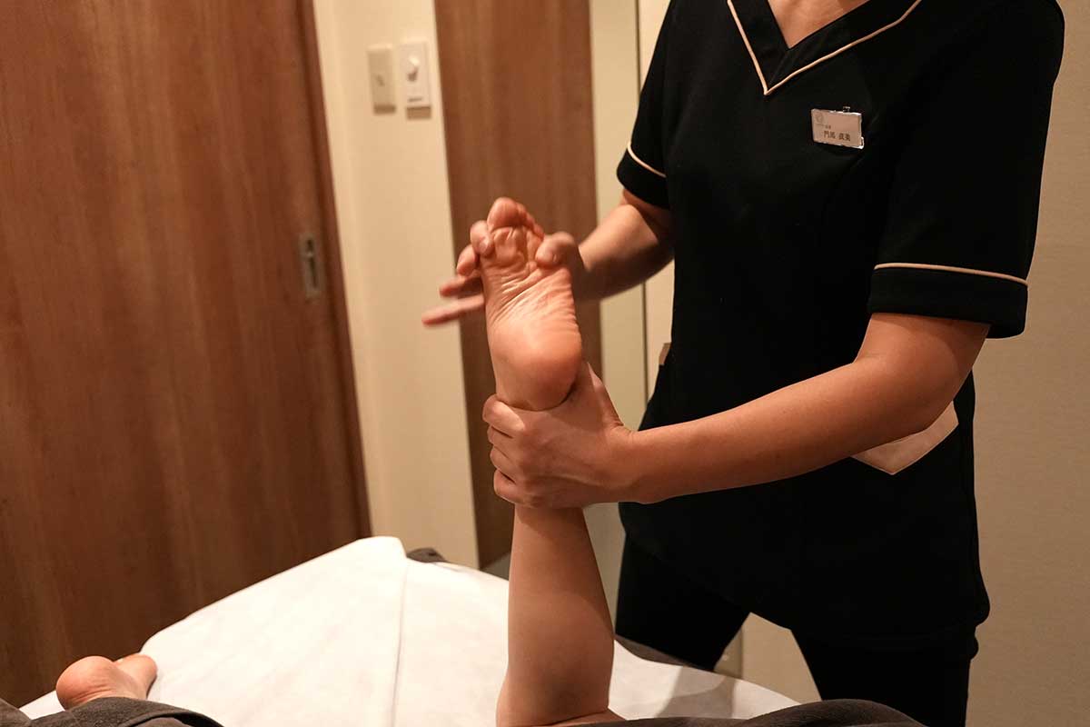 まずはセラピストの門馬さんが骨盤のゆがみ具合や足の可動域などをチェック。
