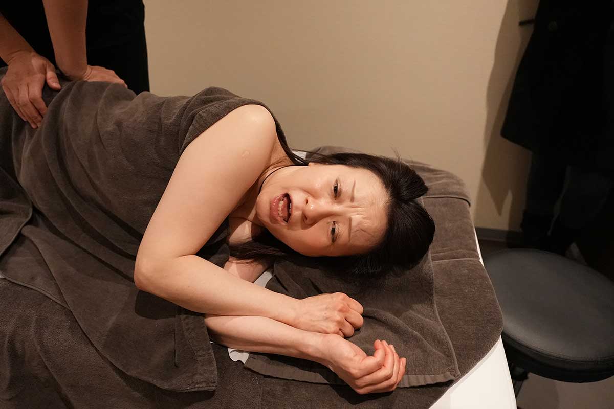 まずはセラピストの門馬さんが、凝り具合などをチェック。