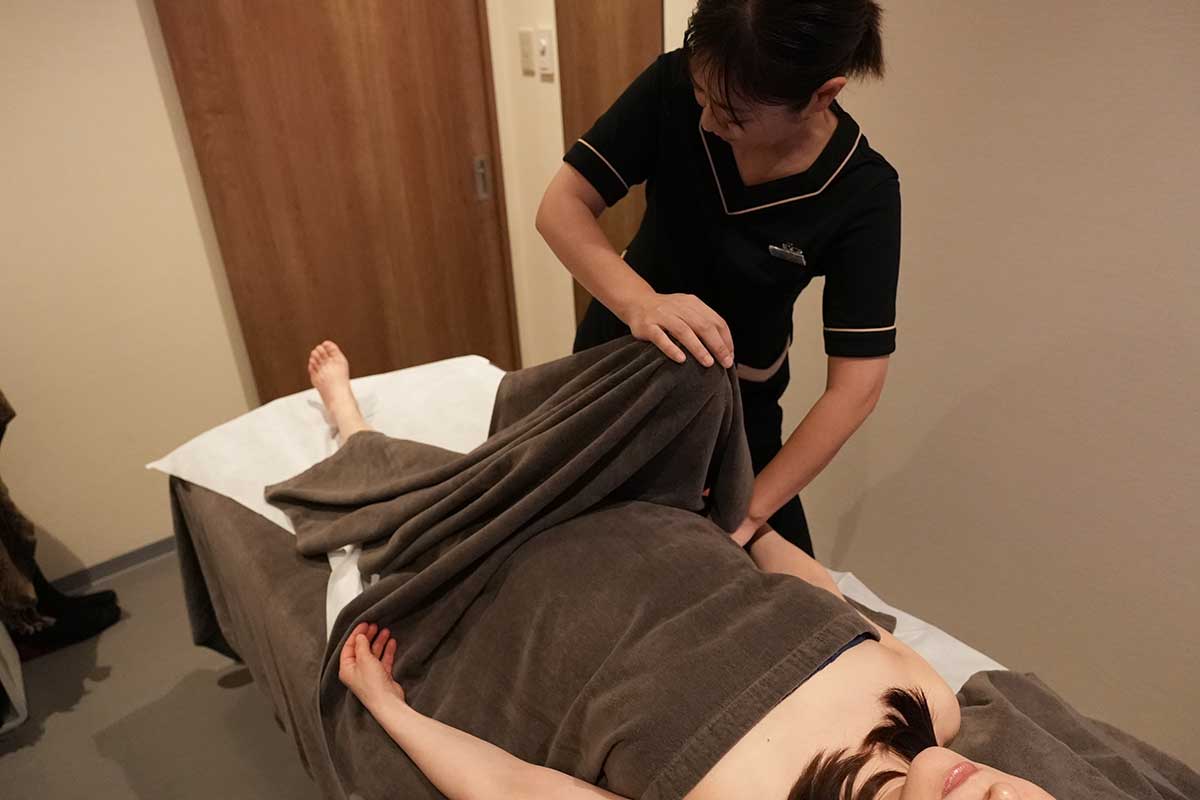 最初に足元を温めることで、施術の効果が高まるんだそう。