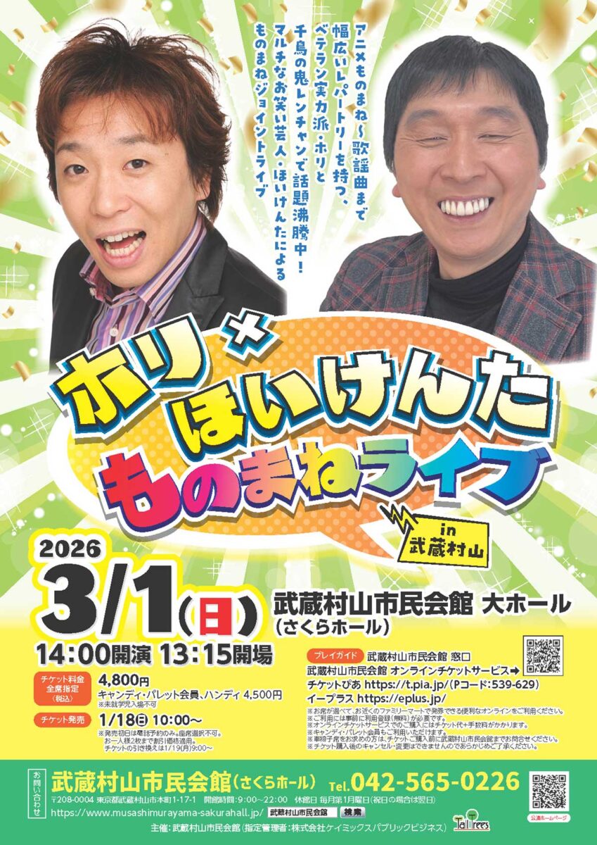 2026年3月1日(日)に武蔵村山市民会館で、ものまね芸人・ホリとほいけんたによる「ものまねライブ」を開催します。