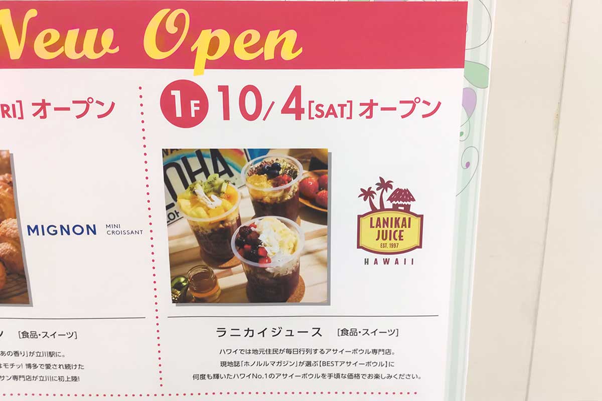 【開店】ハワイ発のアサイーボウル専門店!グランデュオ立川1Fに『ラニカイジュース』が10/4(土)にオープンするみたい