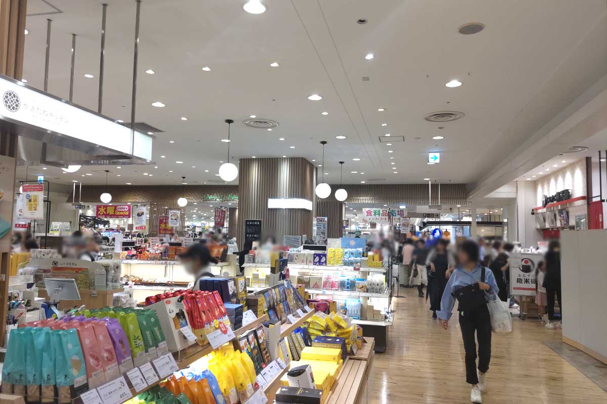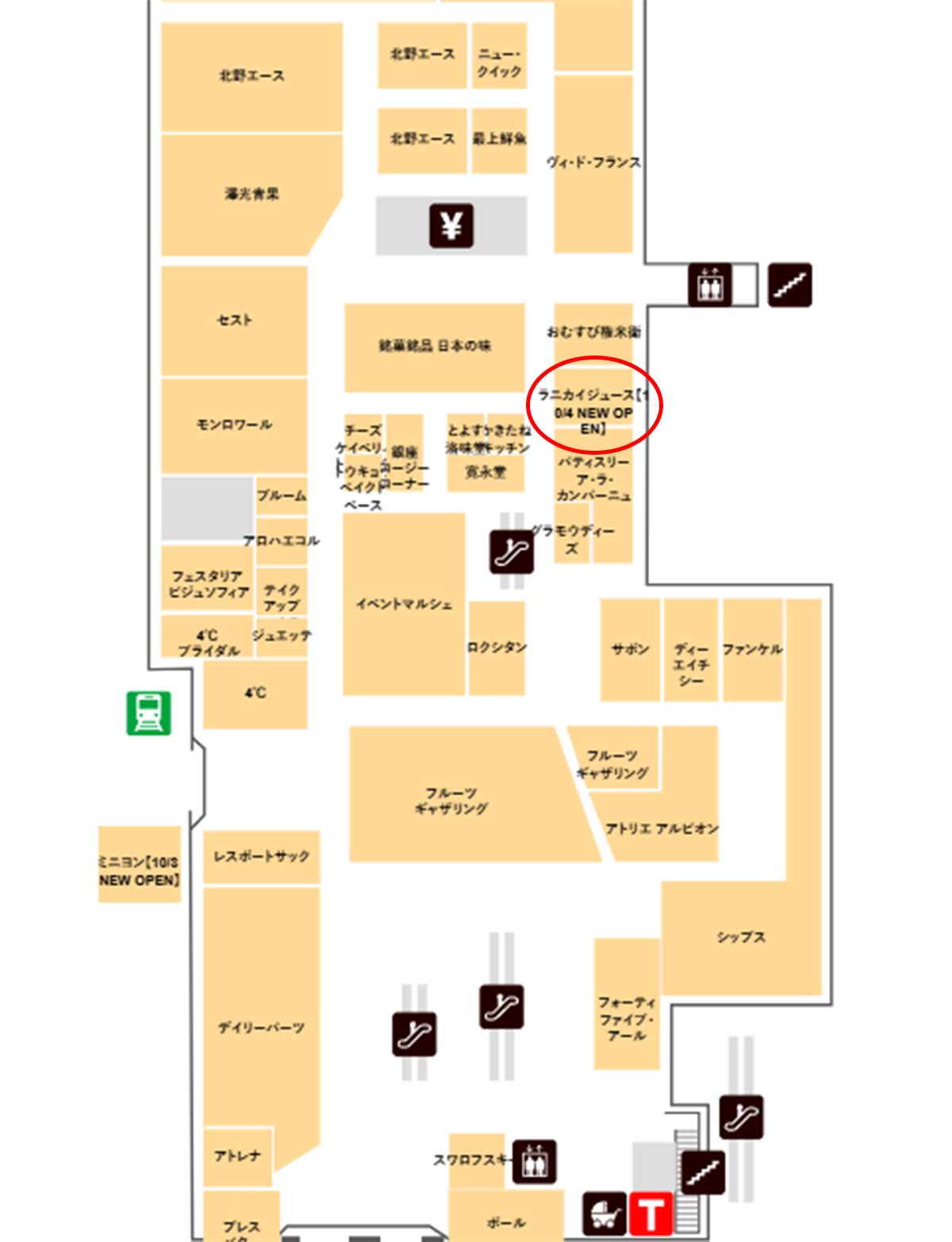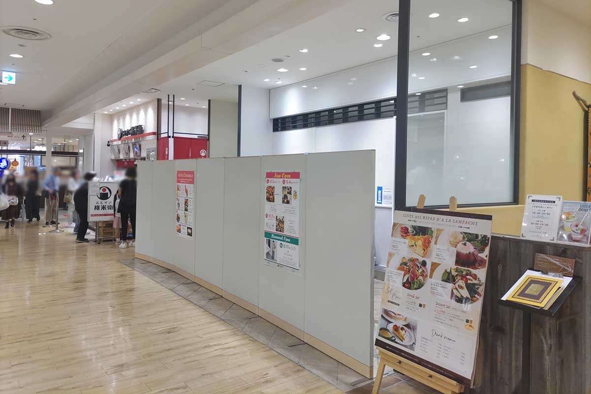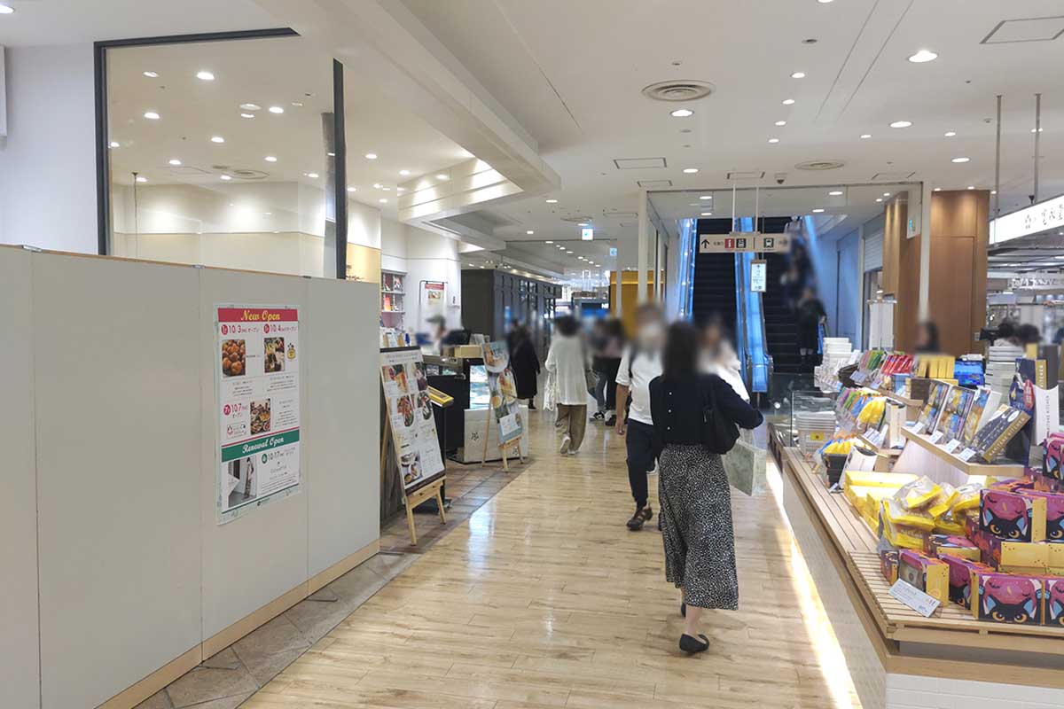 エスカレーターの近くで、『パティスリー ア・ラ・カンパーニュ』と『おむすび権兵衛』の間。
