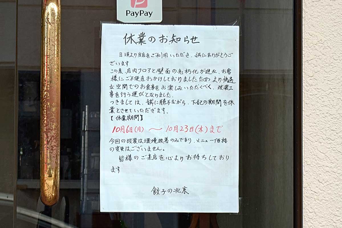 《休業》ちょっとのあいだ餃子おあずけ。砂川町にある『餃子の北京』が改装のため10/6(月)~23(木)の期間休業するみたい