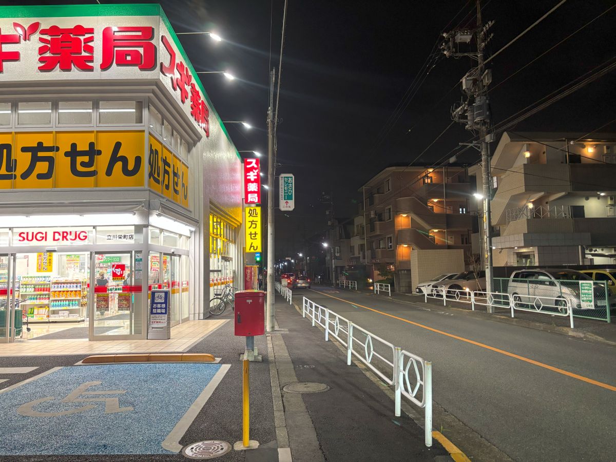 江の島道ぞいを昭和第一学園側から進むとスギ薬局の少し手前に見えてきます。お隣はクリーニング屋さん。