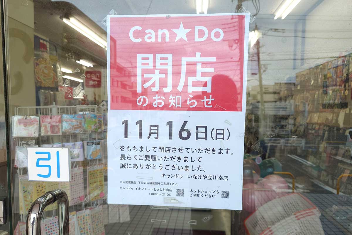 『キャンドゥ いなげや立川幸店』への入口に、閉店についての貼り紙がありました↓