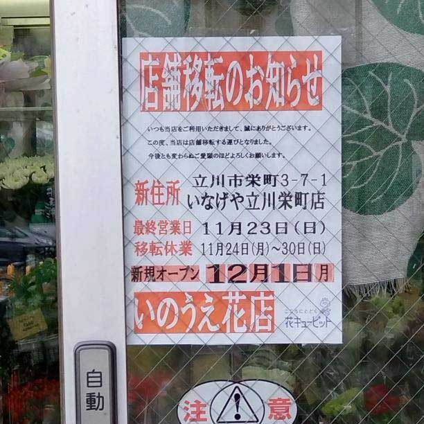【移転】幸町から栄町へ。幸町のスーパー『いなげや 立川幸店』にある花屋『いのうえ花店』が11月23日で閉店して『いなげや 立川栄町店』へ移転するみたい