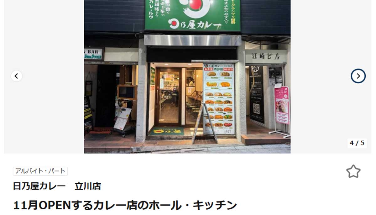 求人サイトに、『日乃屋カレー 立川店』がオープンするとの情報が出ていました。