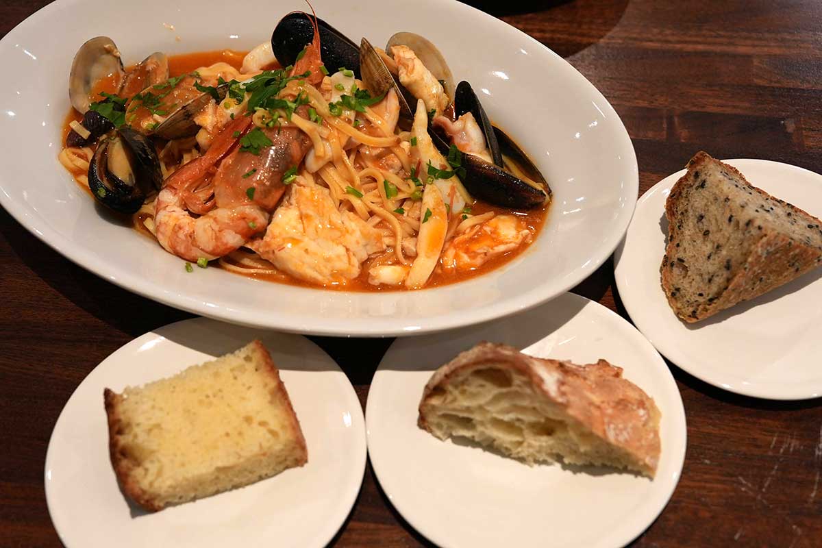 パスタソースを最後まで楽しめるよう、ランチでもディナーでもパンがお替りし放題。
