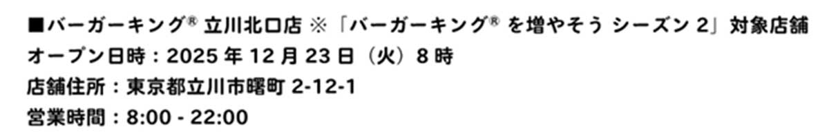 【開店】オープン日と場所わかった!『バーガーキング 立川北口店』は12月23日(火)朝8時『ビックカメラ立川店』隣にオープン