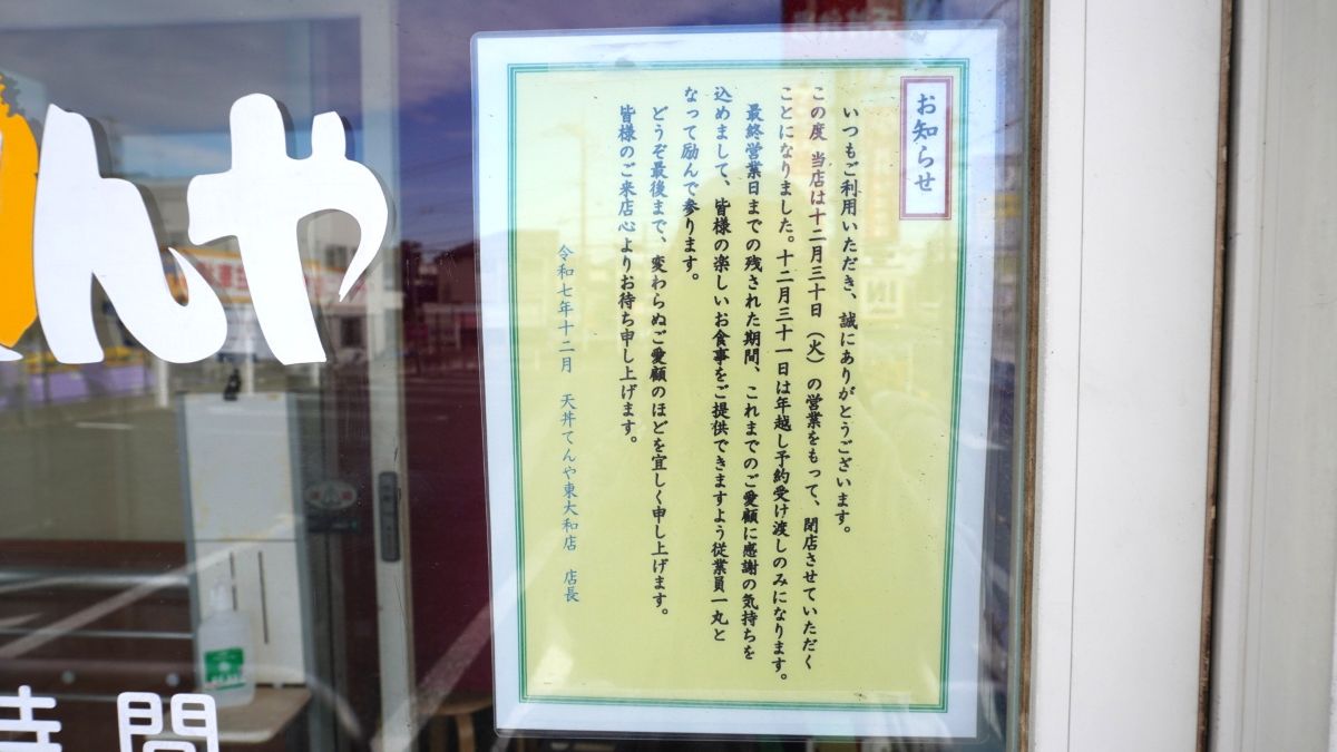 東大和市・奈良橋にある『天丼てんや 東大和店』が2025年12月30日(火)で閉店です。