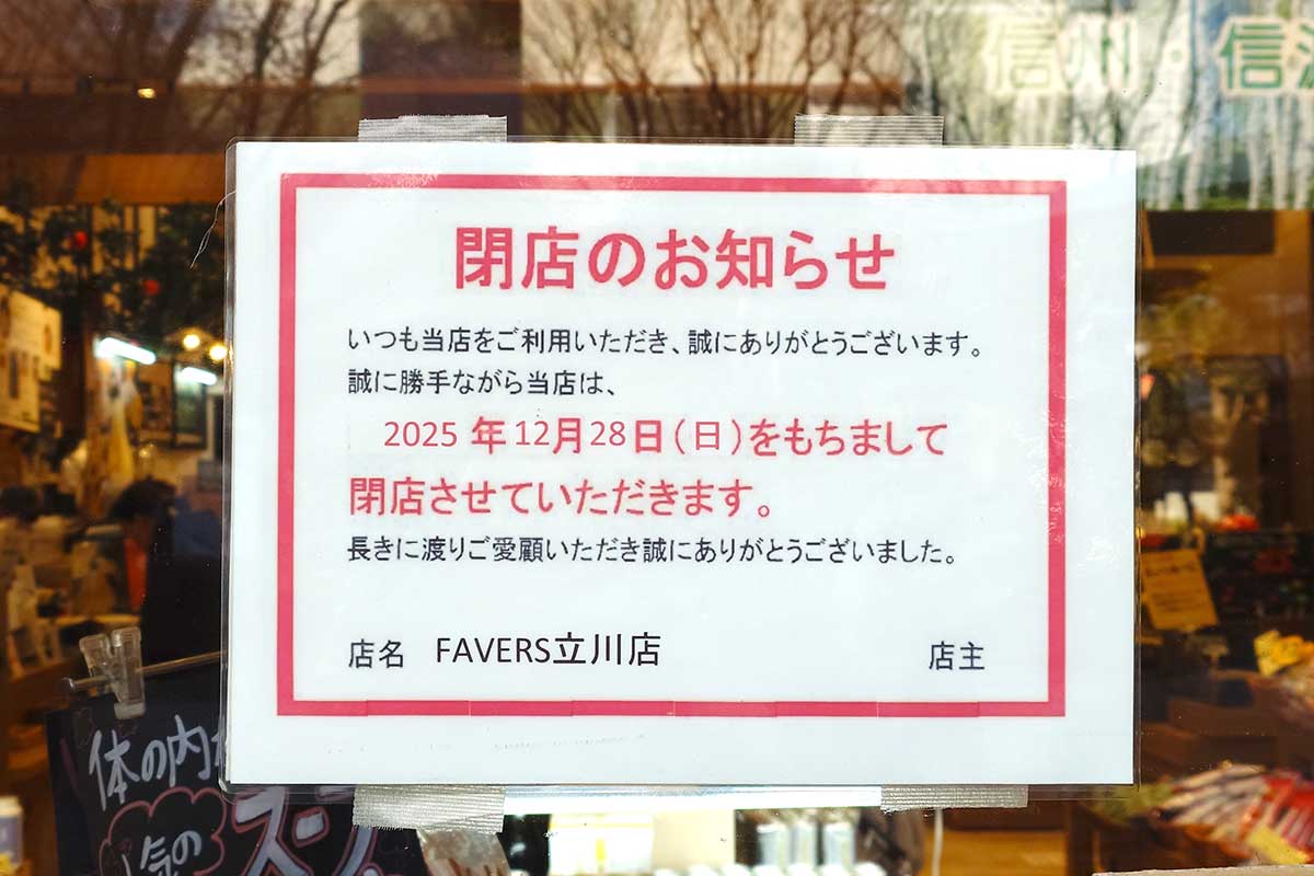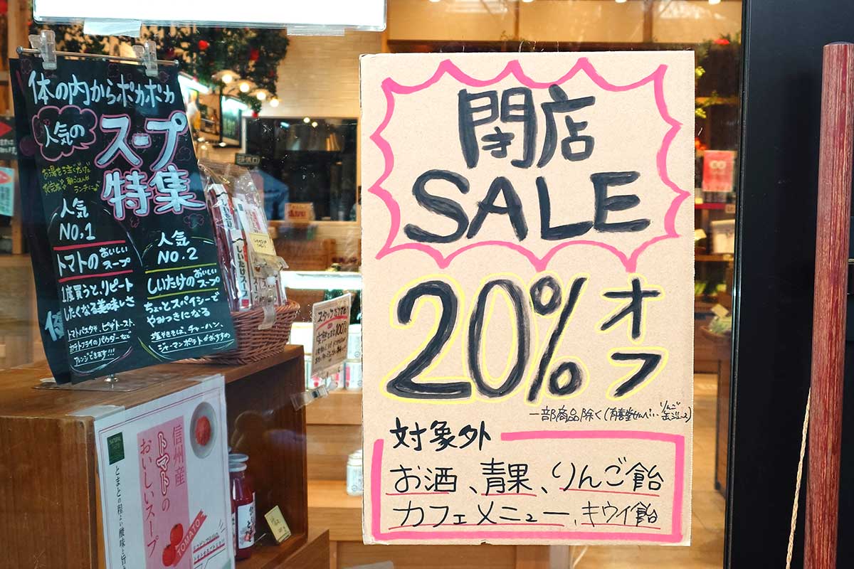 《閉店》20%オフの閉店セール開催中。グリーンスプリングス1階にある長野ローカルフード専門店『フェイバーズ(FAVERS)』が12月28日(日)で閉店するみたい