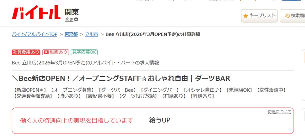 『Bee 立川店』というダイニングダーツバーが3月オープン予定とのこと。