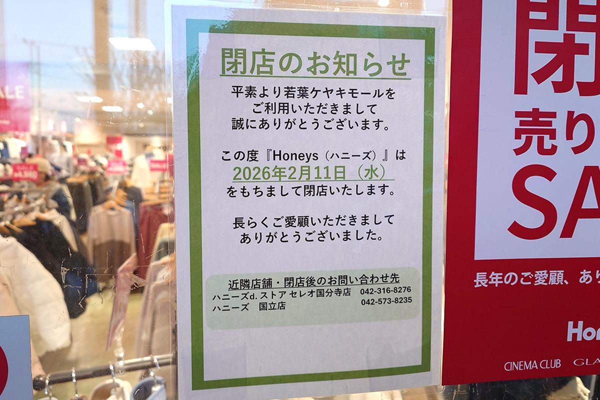 《閉店》これは大きな変化の前兆!?若葉ケヤキモールにあるアパレル『ハニーズ(Honeys) 立川ケヤキモール店』が2月11日(水)で閉店するみたい。閉店セール開催中