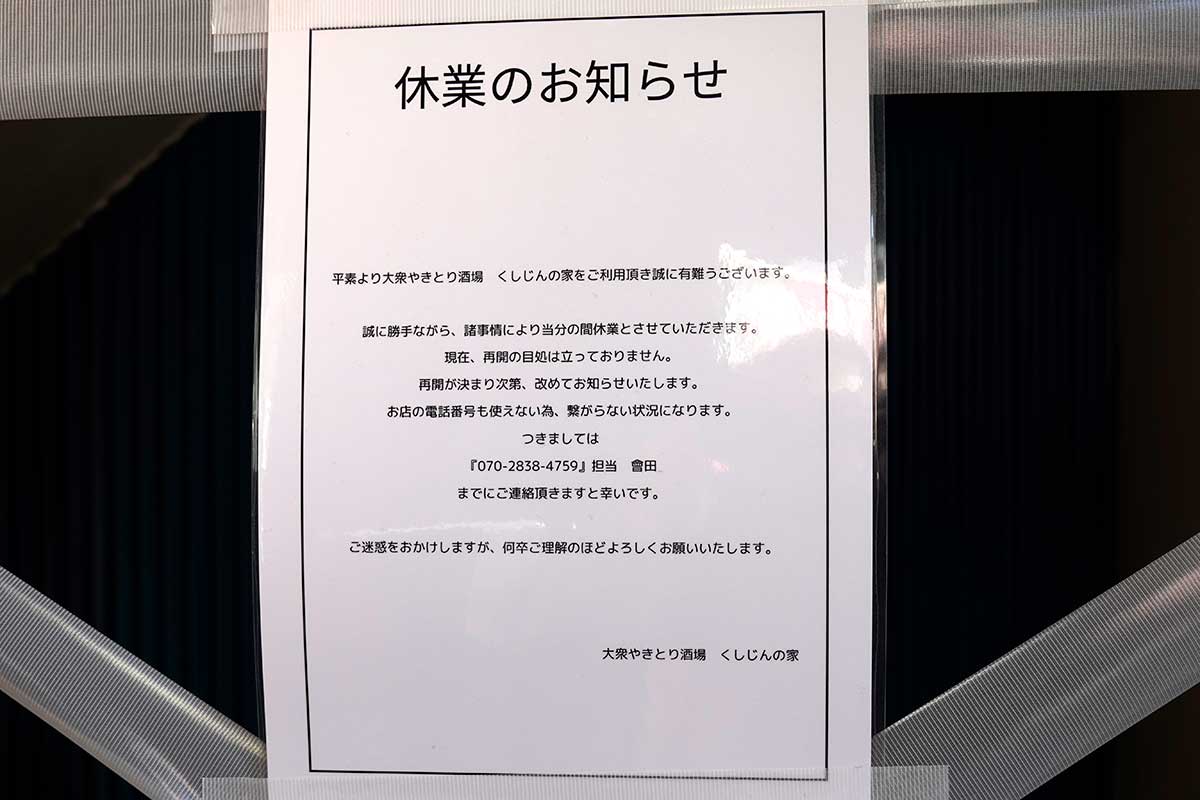 《休業》立川駅南口・諏訪通りぞいにある『大衆やきとり酒場 くしじんの家 立川店』が休業してる。再開時期は未定