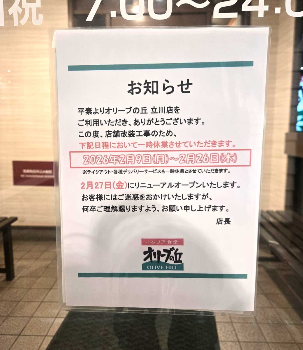 《休業》リニューアル後は特急レーンが登場!?柏町・すずかけ通りぞいのイタリアンファミレス『オリーブの丘 立川店』が2月9日(月)~26日(木)の期間休業するみたい