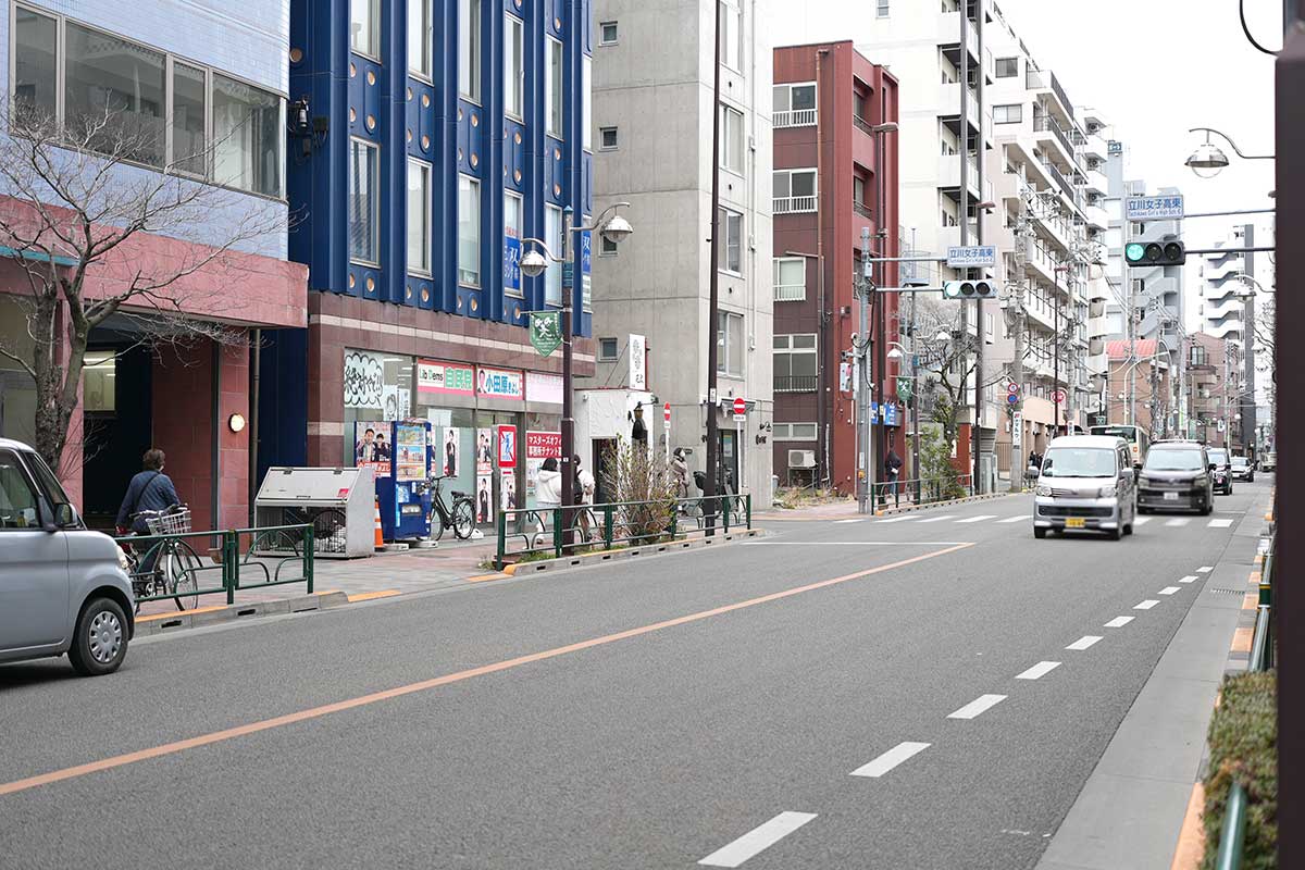 立川駅北口・立川通りをまっすぐ北に8分ほど進むと左側に見えてきます。