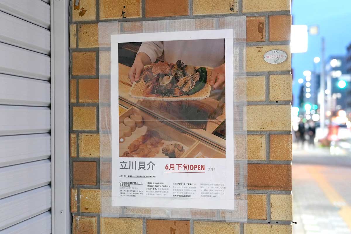 【開店】6月下旬オープン予定。錦町・立川南通りぞいに貝専門店の居酒屋『立川貝介』ってお店ができるみたい。『冨士鮨』のあったところ