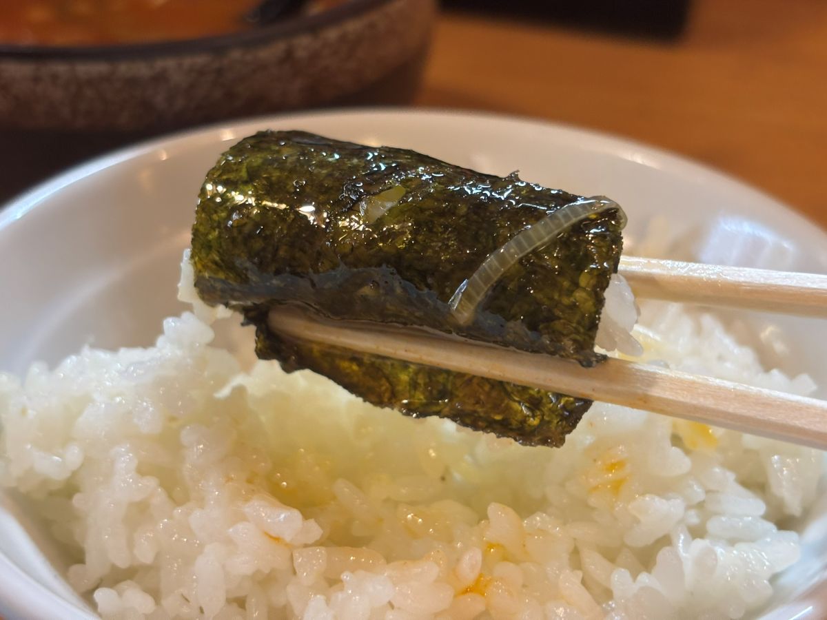 スープを吸った海苔をご飯で包むと、濃い味でご飯が進みます。