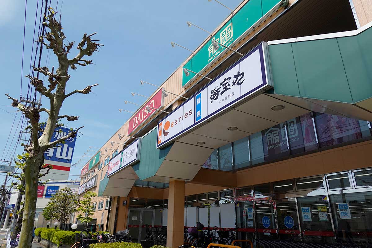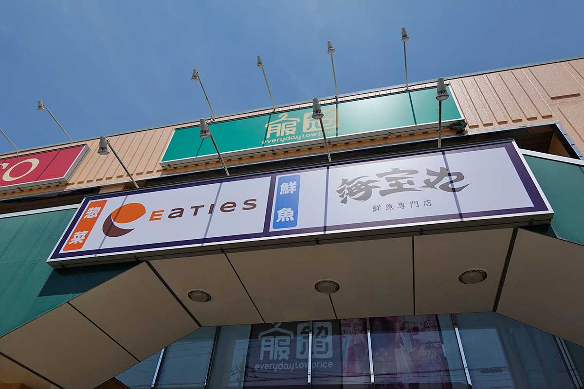 すずかけ通り側の店舗入口上には、新しい生鮮テナントのサインが掲げられています。