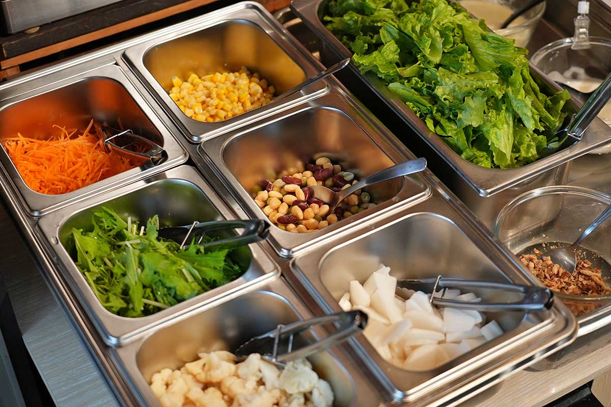 食べ放題につくだけでなく平日ランチはサラダバーが無料です。※セットメニューを注文または会計が1,390円以上。