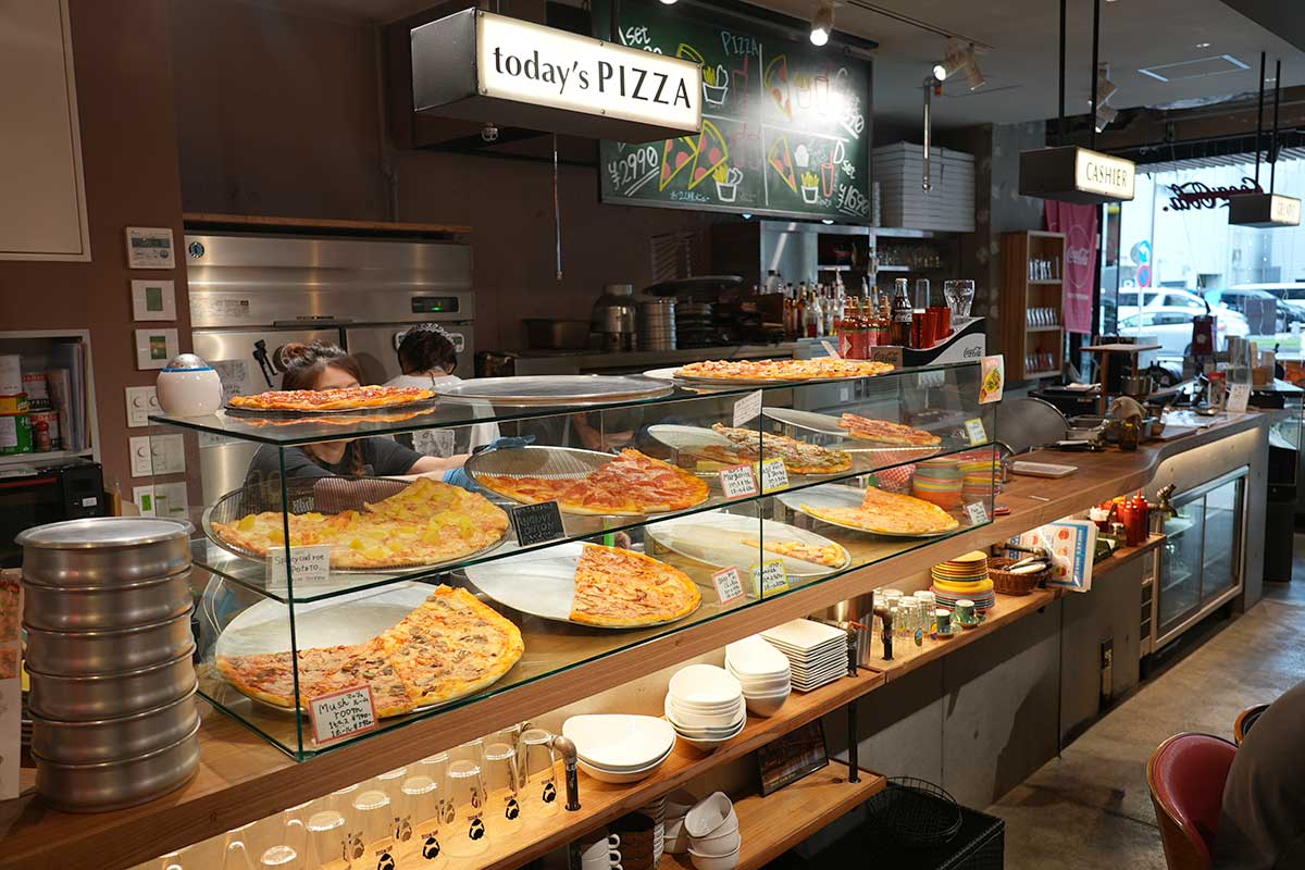 直径50cmのビッグなピザがずらっと並んでます。注文は1スライスからでホールももちろんOK!