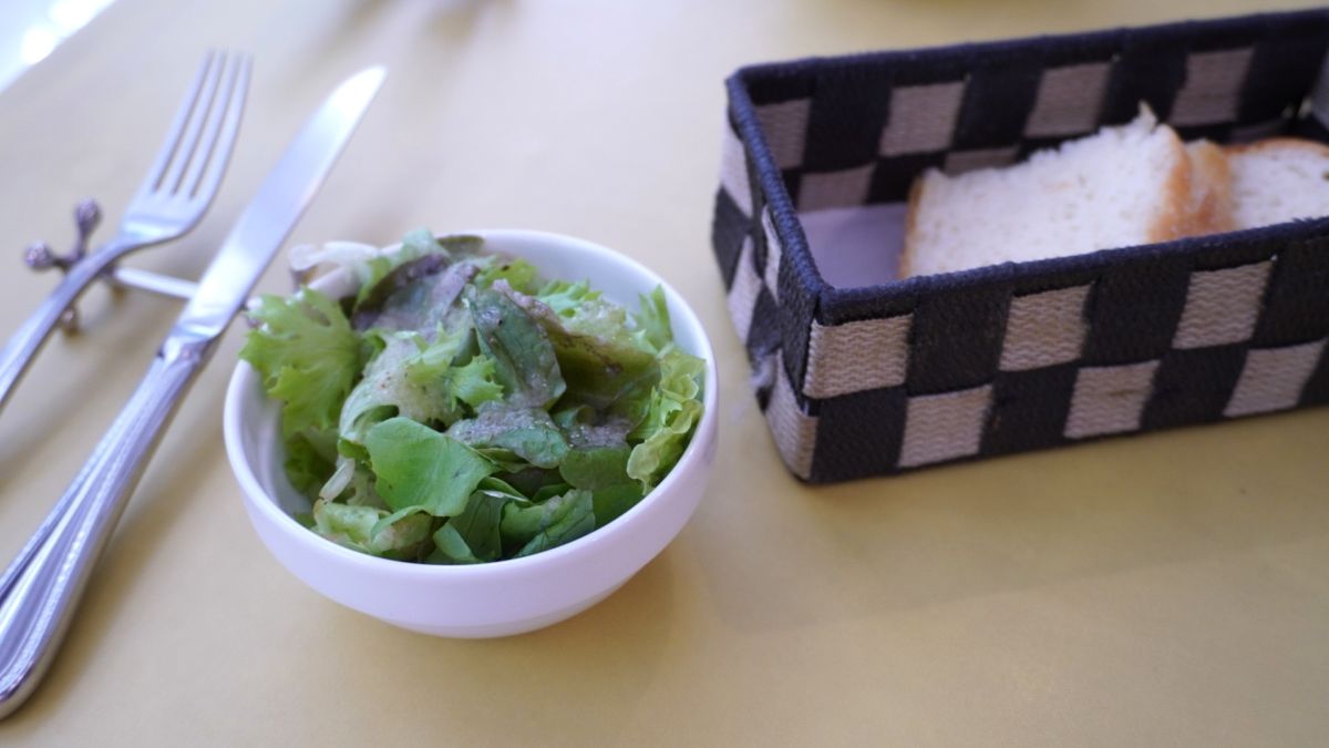 最初に運ばれてきたのはサラダとフォカッチャ↓