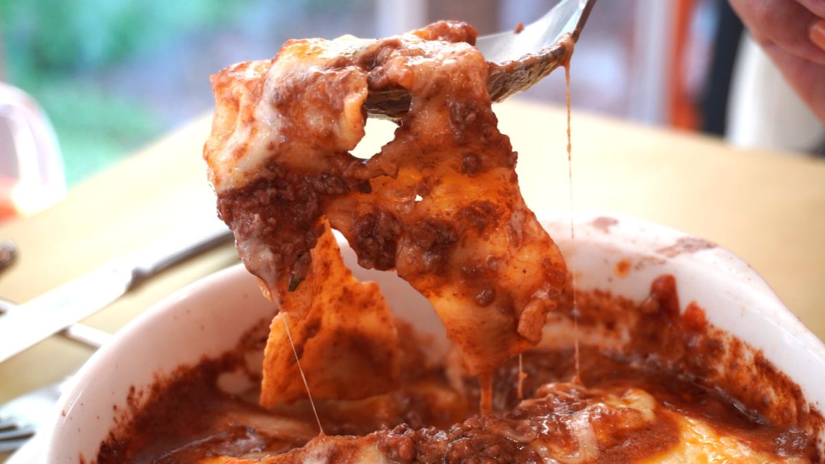 ミートソースがグツグツしていて、見るからに熱そうです。