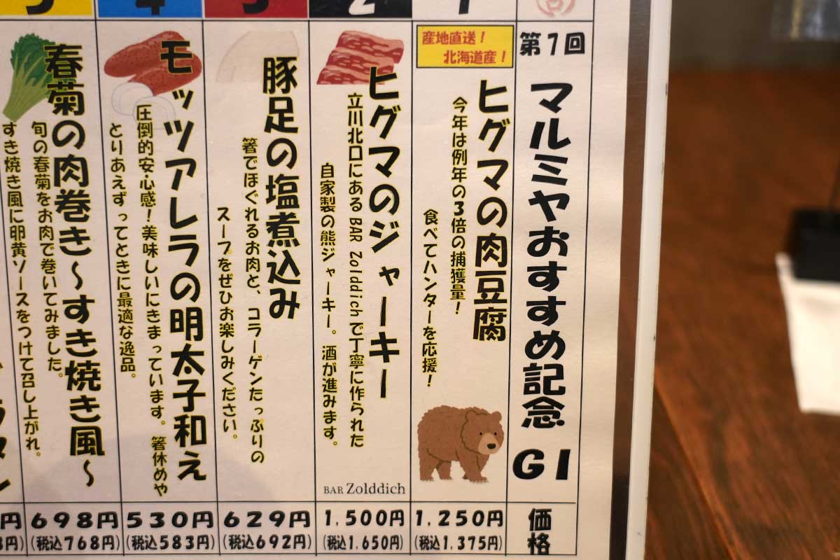 ヒグマ料理、食べてみる?立川駅南口にある居酒屋『煮込み専門店マルミヤ』でヒグマ料理の提供が始まってる