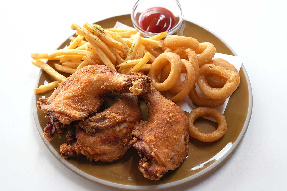 プレミアムチキン3本・オニオンリング・ポテトフライがついた、