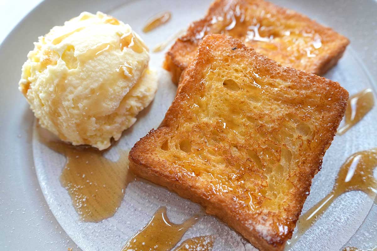 こんがりときつね色に焼かれたデニッシュとたっぷりのメープル、添えられたバニラアイスが、スイーツ欲をどっぷり満たしてくれます