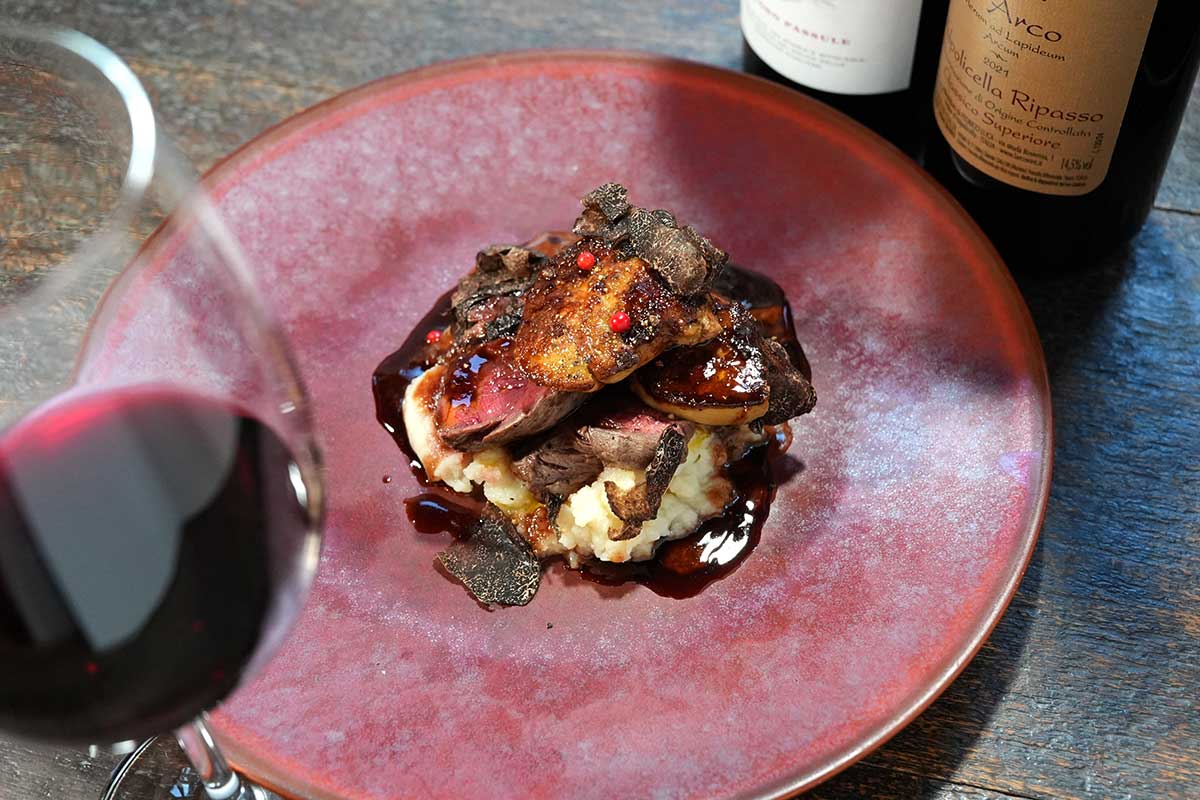 メイン「黒毛和牛フィレ肉とフォアグラのロッシーニスタイル トリュフと赤ワインのソース」
