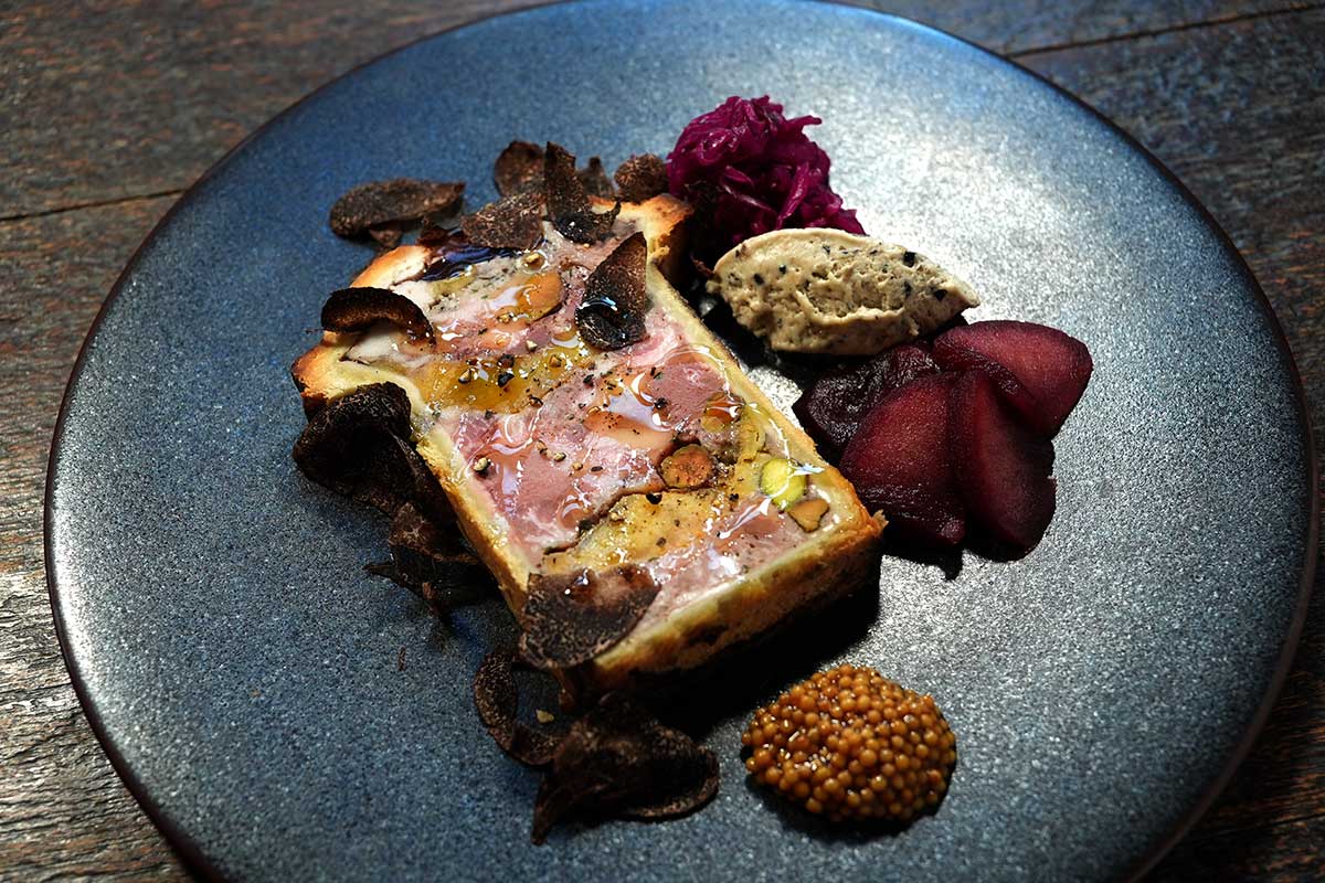 前菜「ホロホロ鳥とイベリコ豚 安納芋のパテ・アンクルート」
