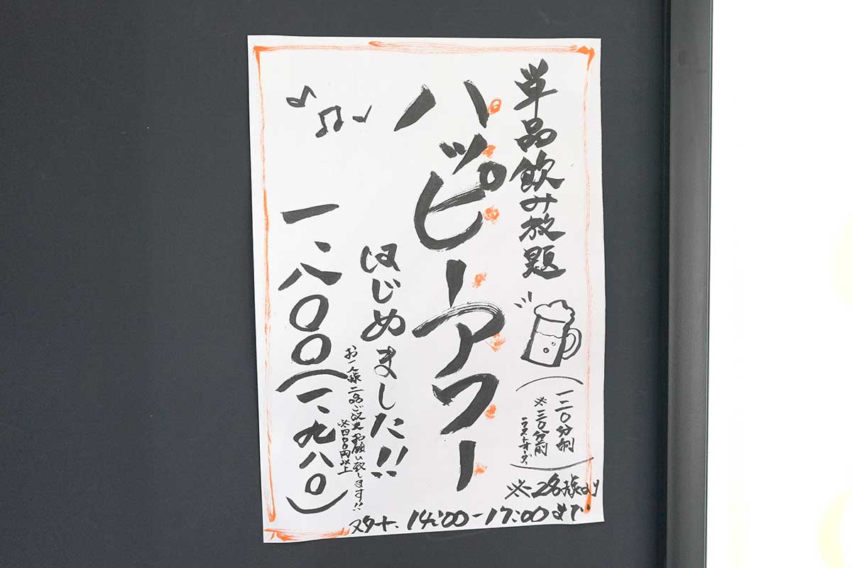120分制(30分前L.O.)で1,980。早めの時間帯から楽しくなっちゃいたい時はいかがでしょう。