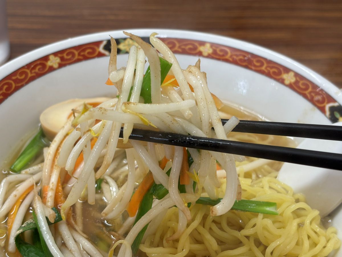 サッと炒められたもやし、にんじん、ニラはシャキシャキの食感。