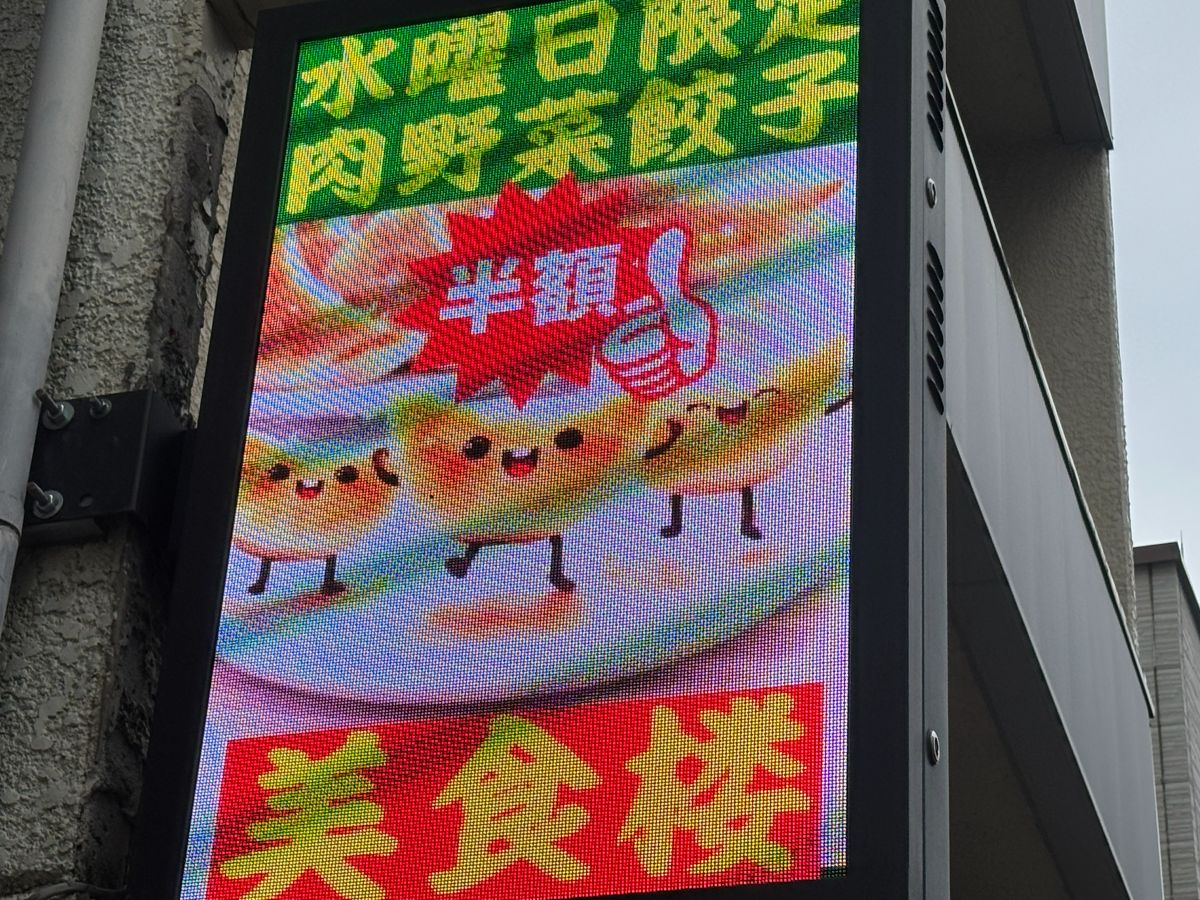 赤い看板に、異国情緒あふれるCGアニメが流れるディスプレイ看板。