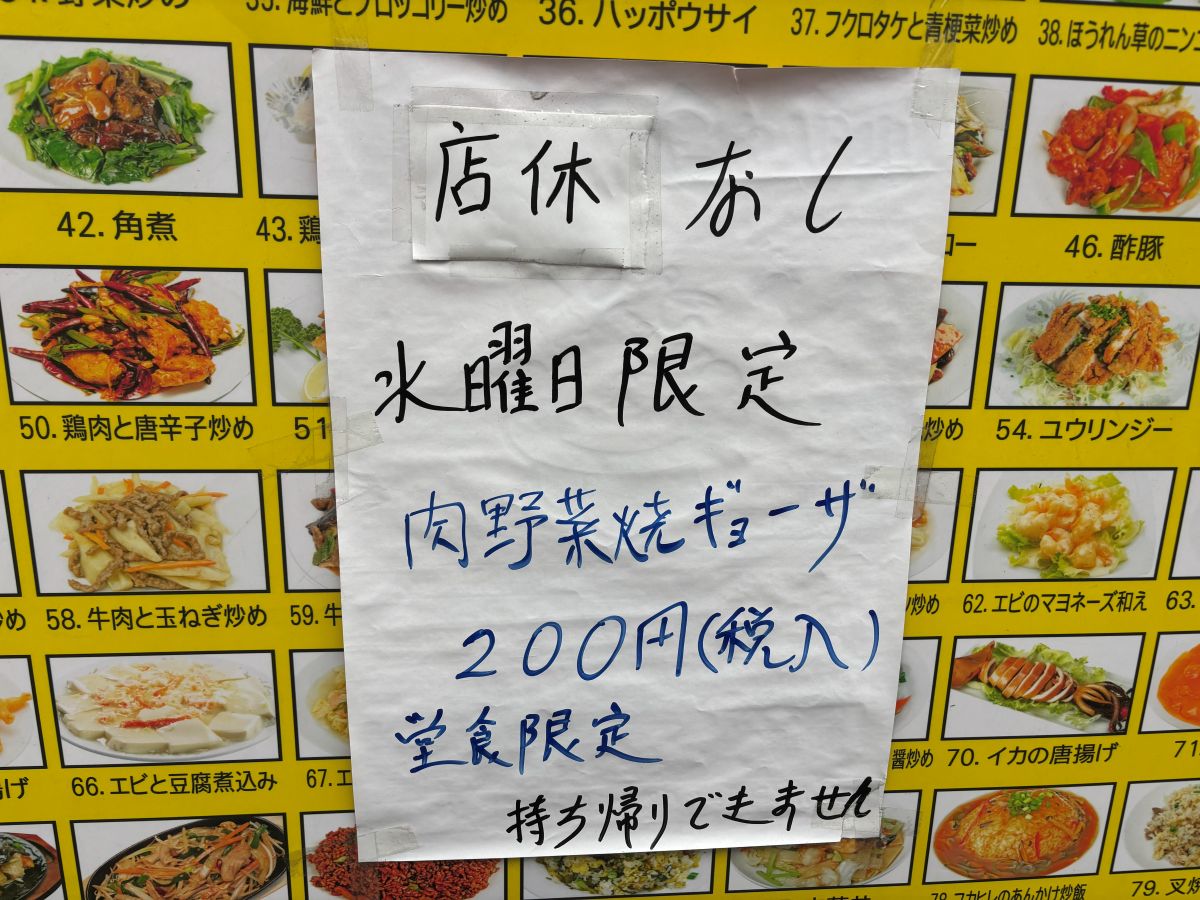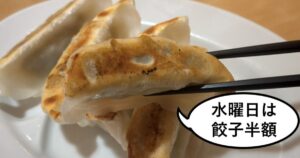水曜日限定 肉野菜餃子半額の文字。