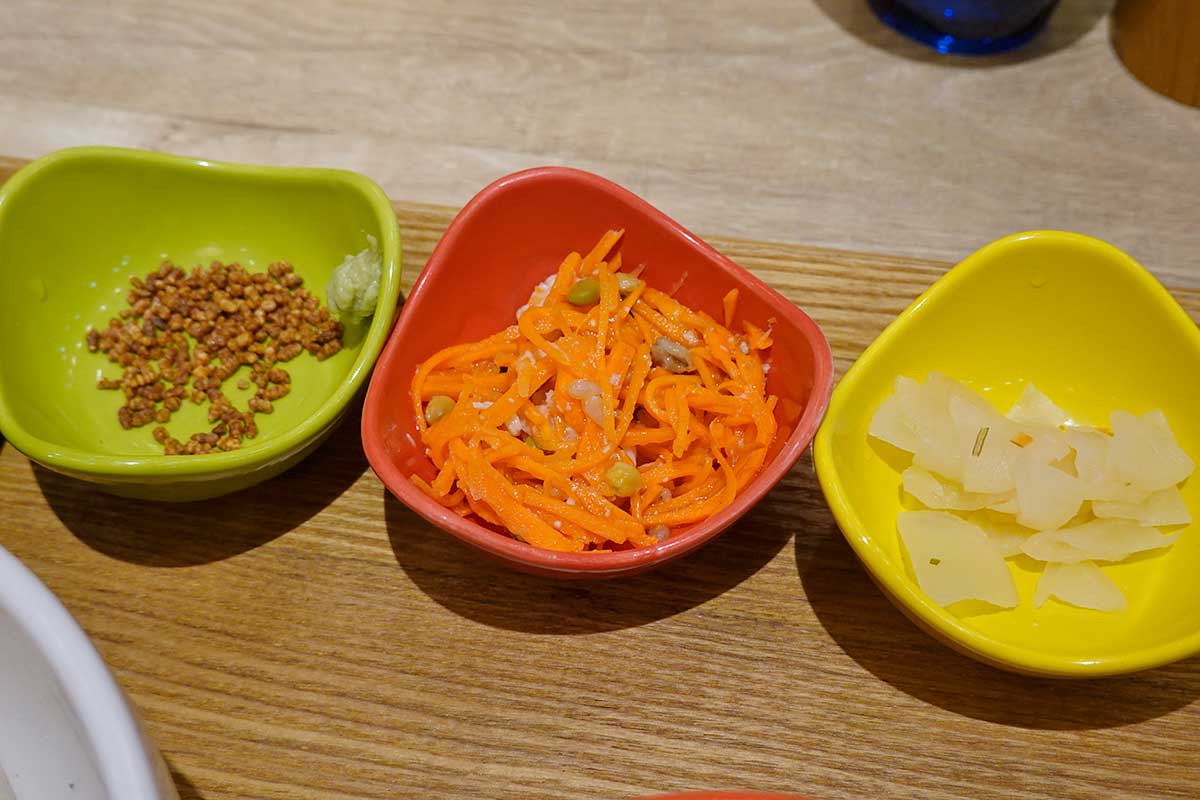 お茶漬け用のあられ、キャロットラペ、漬物です。