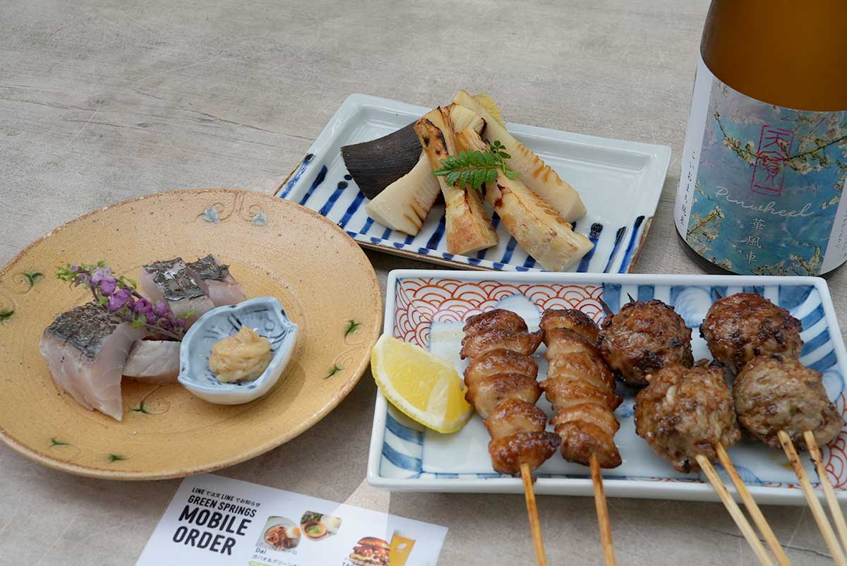 左から「お刺身 サワラ藁タタキ」1,280円、「炭焼き竹の子」1,080円、そして串は「燻製ぼんじり」1本280円、「鶏つくね」1本360円。日本酒は本日のオススメより(仕入により変更あり)。