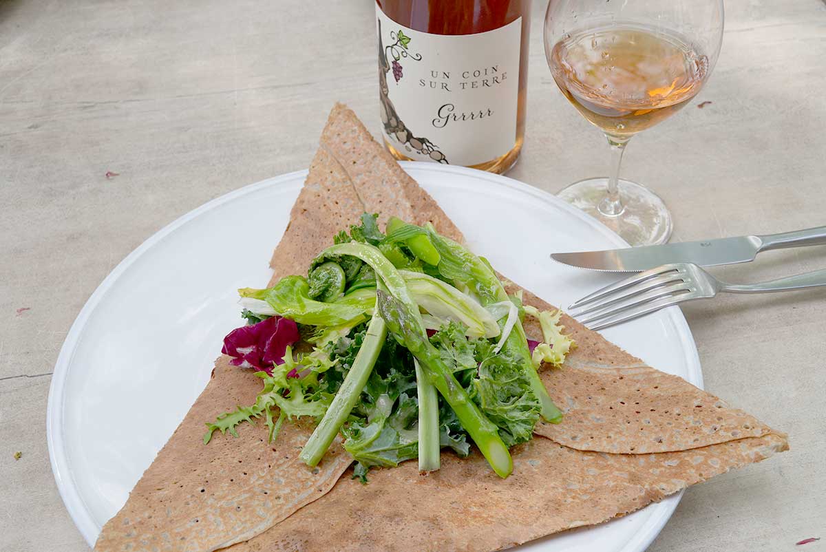 蕎麦粉100%のガレットはまずそのレース状の焼き目の美しさが特徴で、一口食べるごとに大地の香りが鼻腔を抜けていきます。自然派オレンジワインとの相性もぴったり。