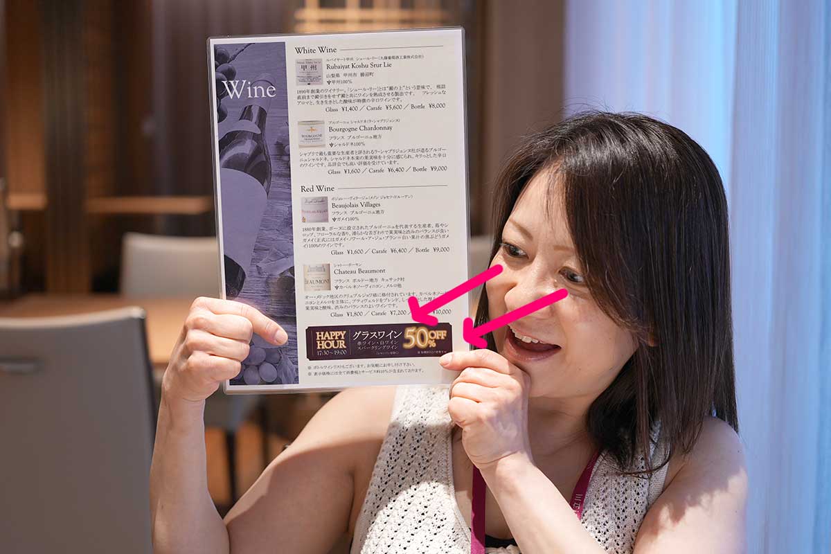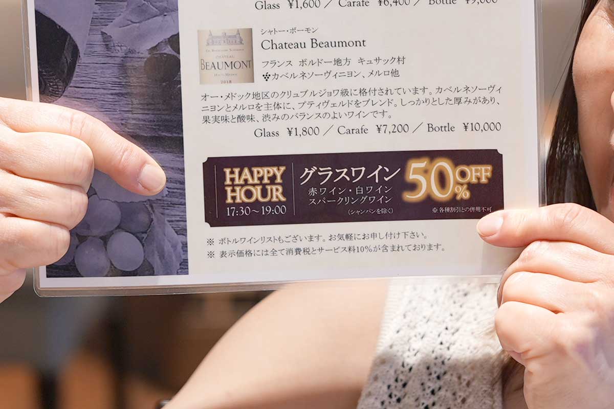 スパークリングワイン(シャンパン除く)を含めたグラスワインがすべて50%オフ、半額になります。