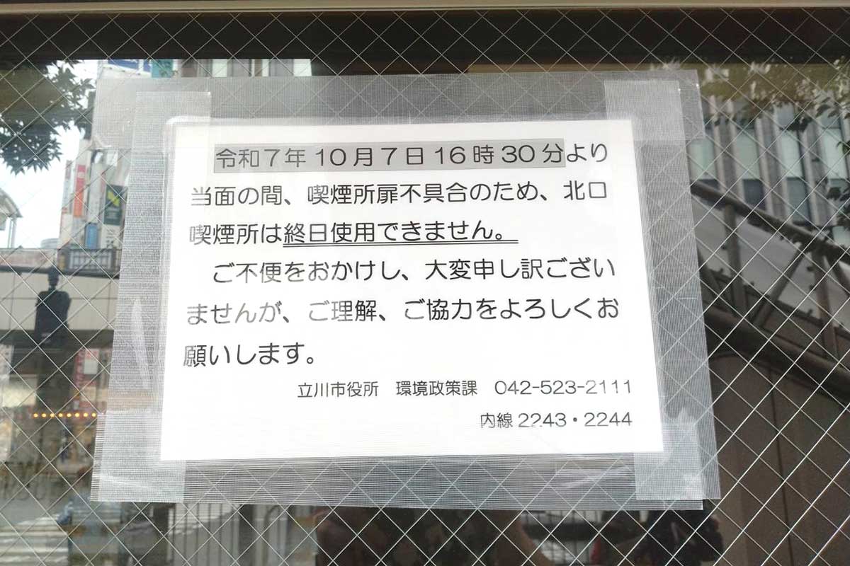 立川駅北口の公衆喫煙所が扉の不具合のためしばらくのあいだ利用できなくなってる