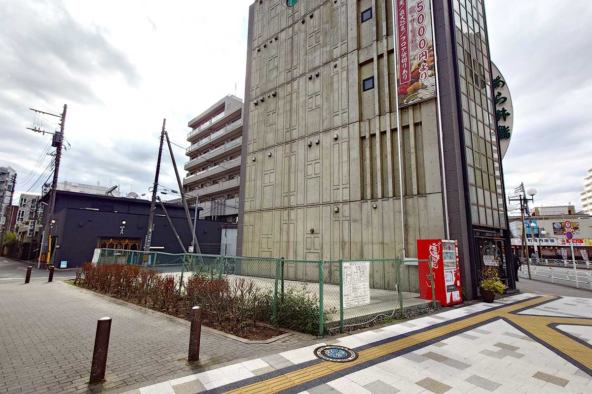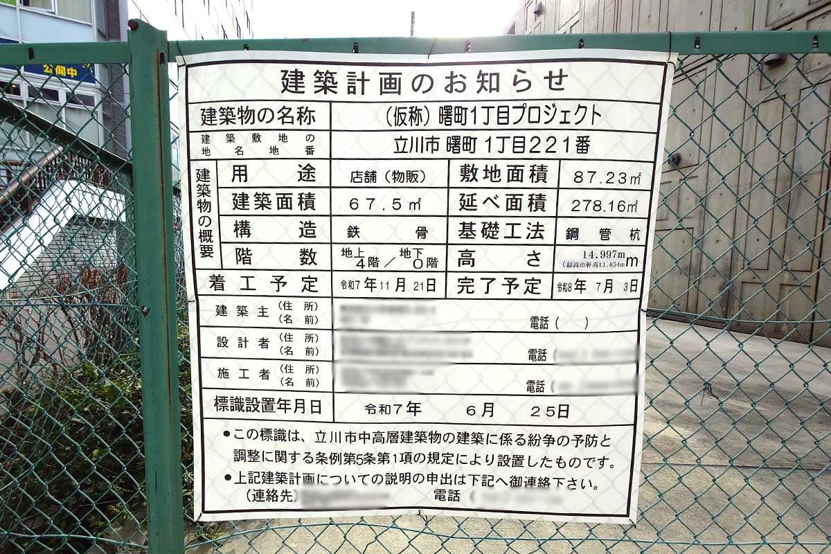 地上4階建ての建物が建つみたい。立川駅北口『あら井鮨総本店』となりに建築計画のお知らせの標識がたってる