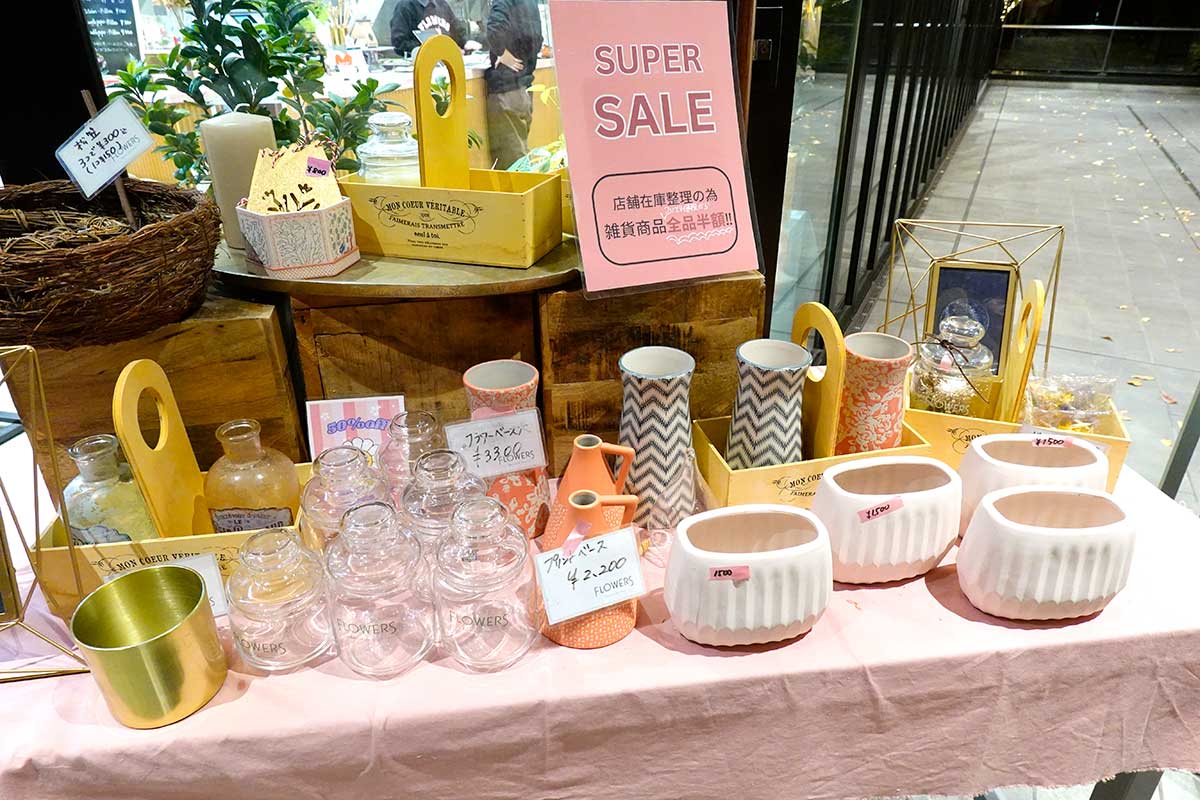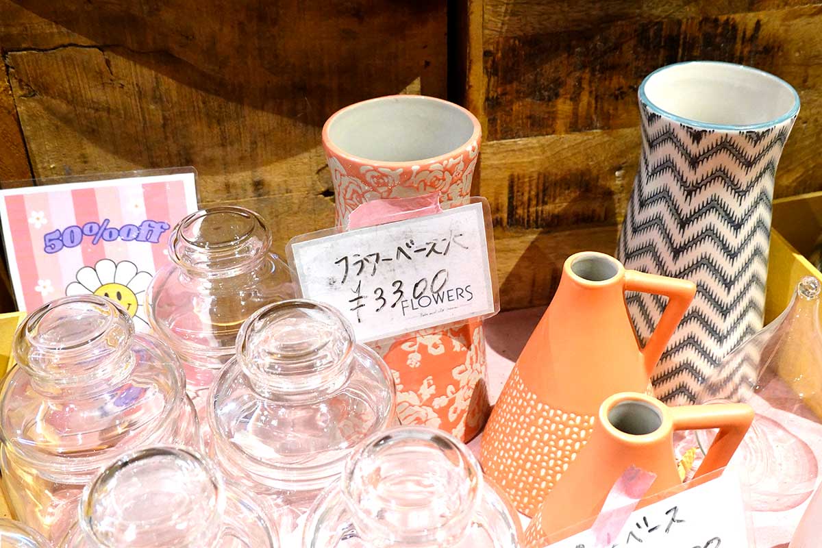 花瓶などがお安く!グリーンスプリングス2階の『FLOWERS BAKE&ICE CREAM』で雑貨半額セール開催してる