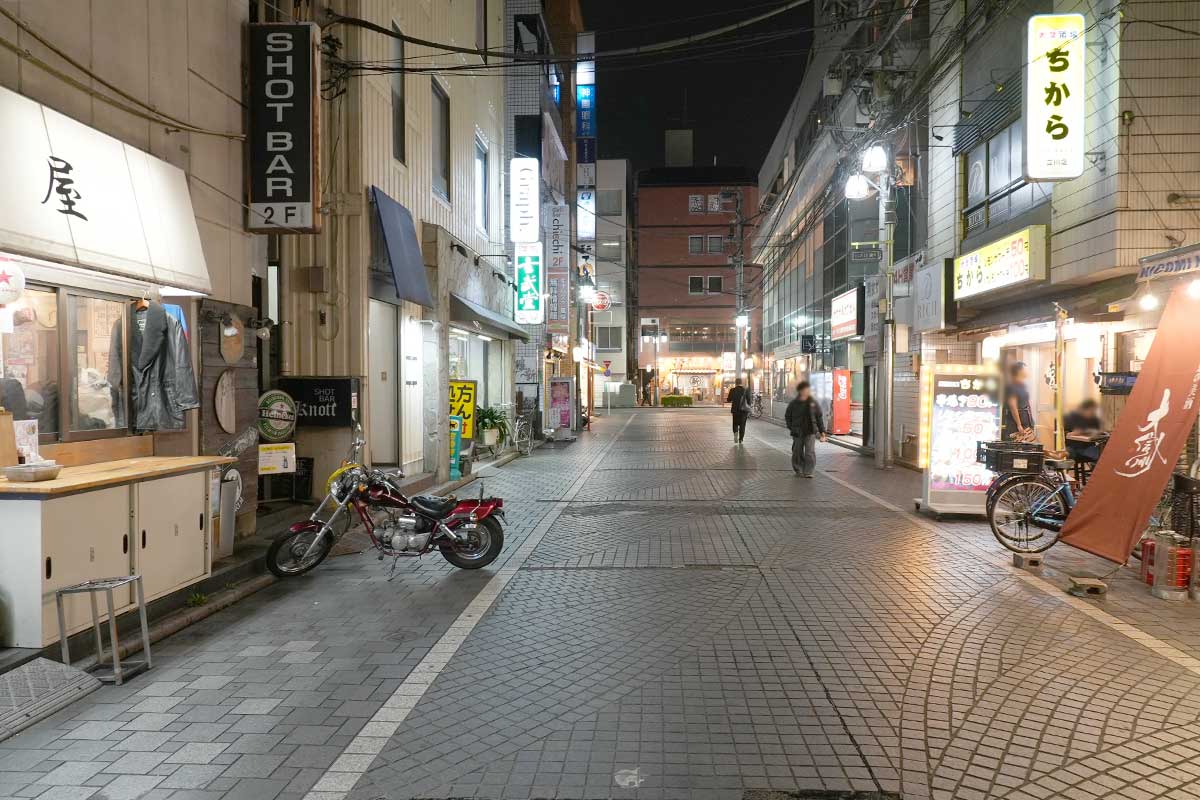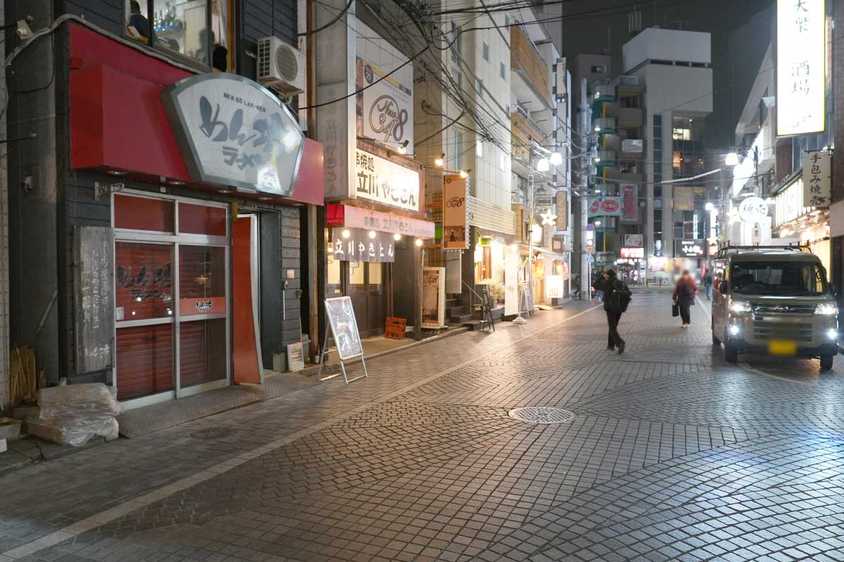 立川駅南口の、『立川やきとん』や『ギョウザバーりん屋』などの大衆居酒屋がひしめく通り。