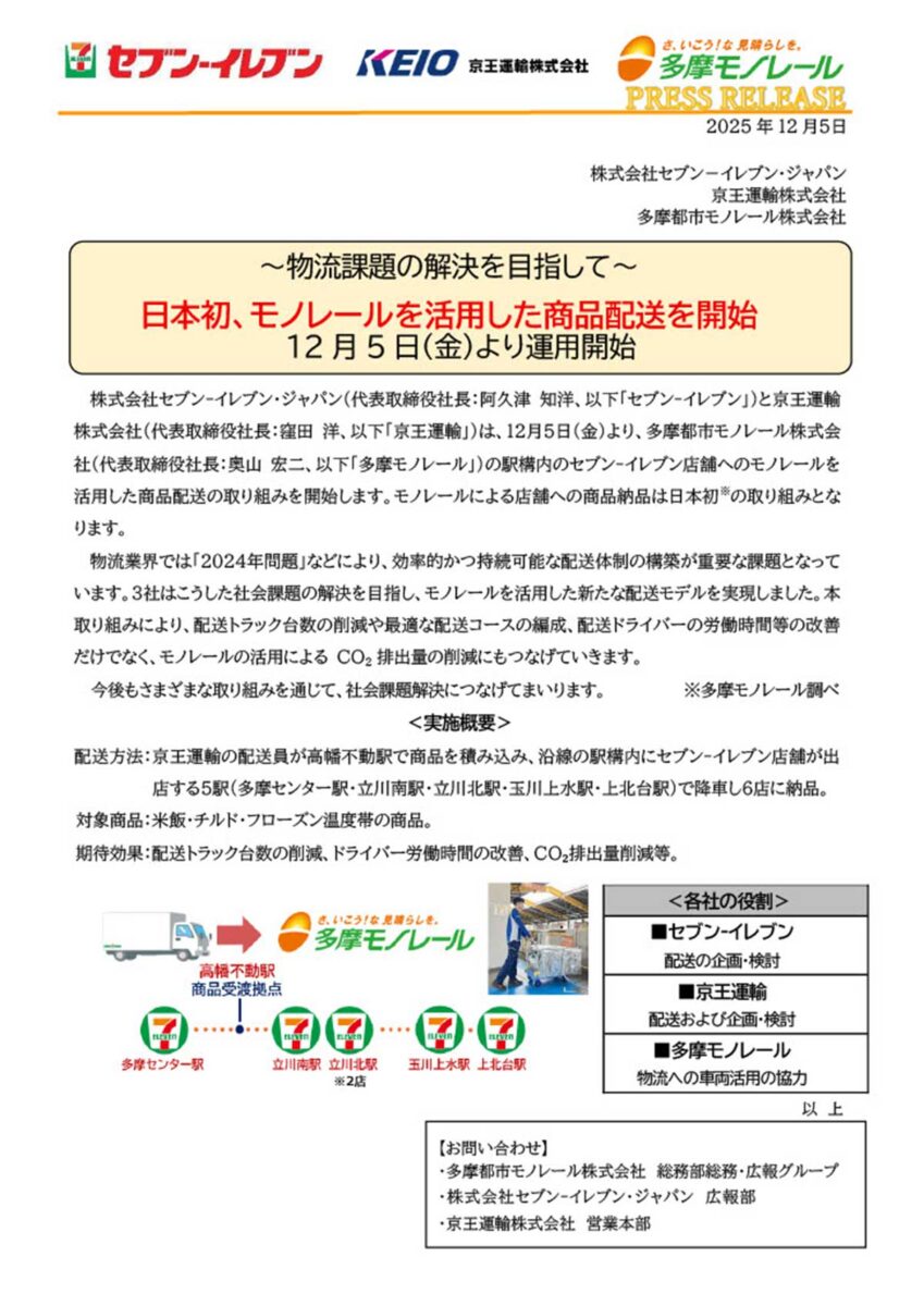 多摩モノレール沿線の駅(多摩センター駅・立川南駅・立川北駅・玉川上水駅・上北台駅)にある『セブン-イレブン』の一部の商品を、多摩モノレールで配送する仕組みが開始されたみたい。