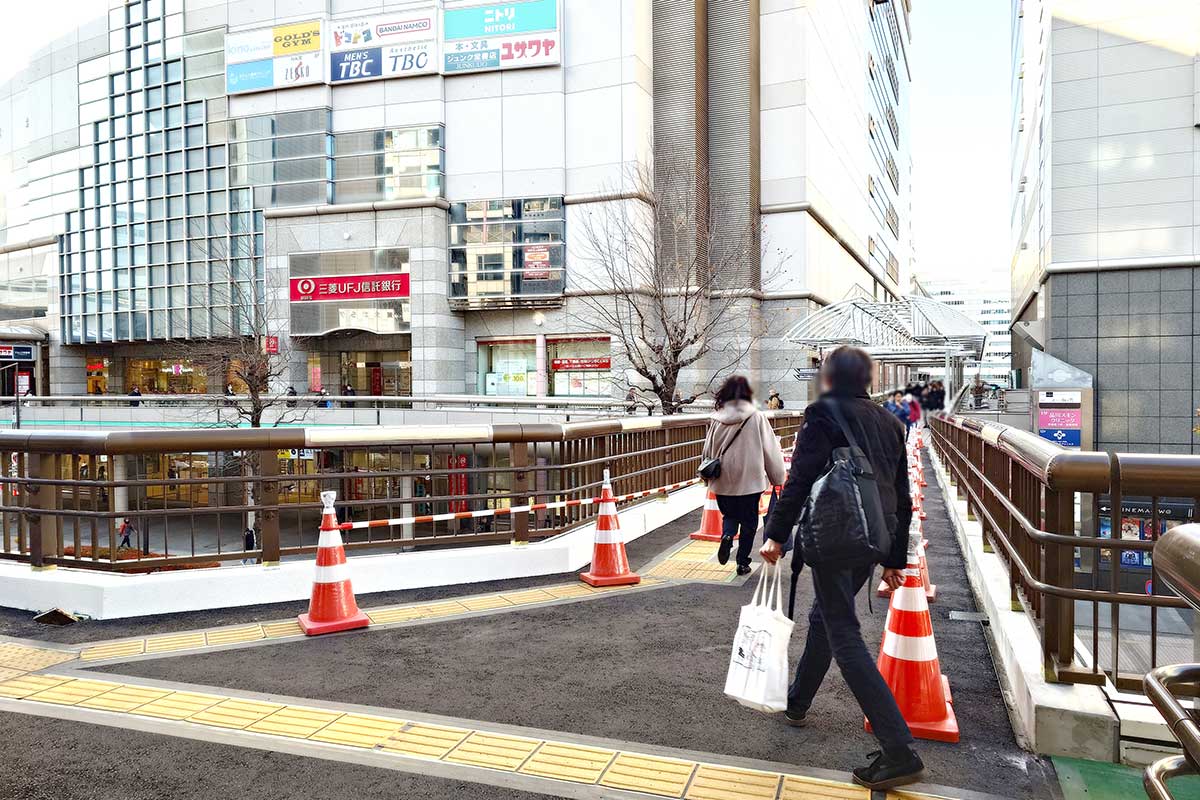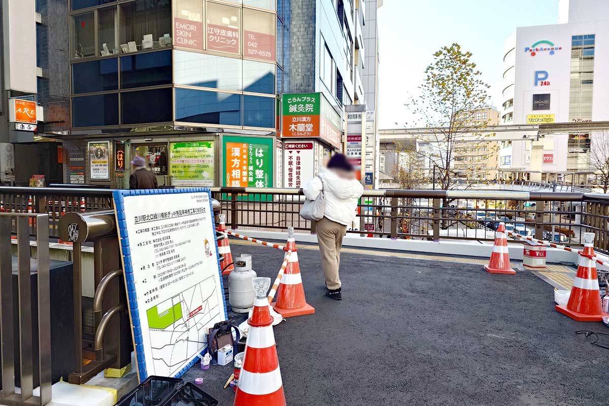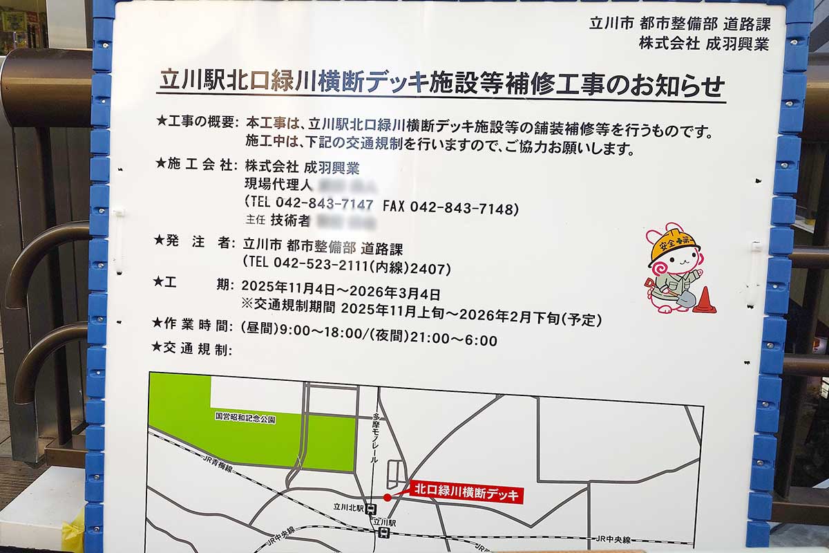 〖工事中〗立川駅北口緑川横断デッキが補修工事してて交通規制してる。交通規制は2026年2月下旬終了予定