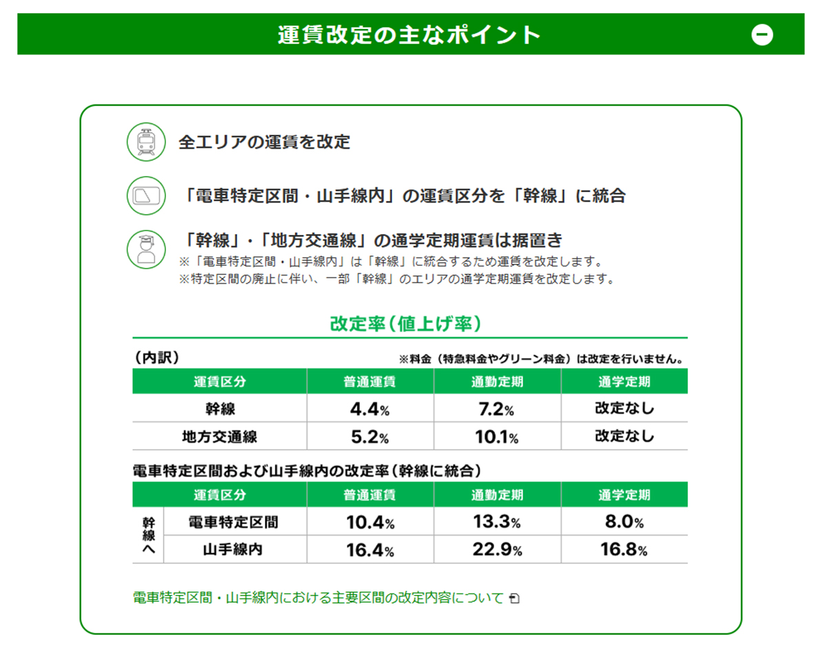 • 「電車特定区間・山手線内」の運賃区分を「幹線」に統合